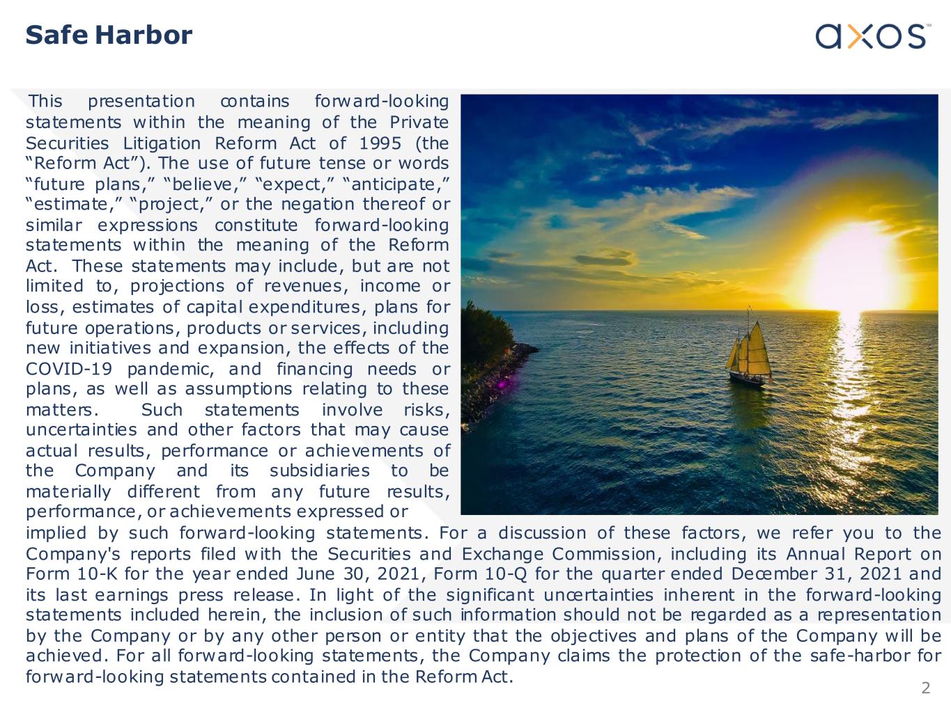 2 Safe Harbor This presentation contains forward-looking statements within the meaning of the Private Securities Litigation Reform Act of 1995 (the “Reform Act”). The use of future tense or words “future plans,” “believe,” “expect,” “anticipate,” “estimate,” “project,” or the negation thereof or similar expressions constitute forward-looking statements within the meaning of the Reform Act. These statements may include, but are not limited to, projections of revenues, income or loss, estimates of capital expenditures, plans for future operations, products or services, including new initiatives and expansion, the effects of the COVID-19 pandemic, and financing needs or plans, as well as assumptions relating to these matters. Such statements involve risks, uncertainties and other factors that may cause actual results, performance or achievements of the Company and its subsidiaries to be materially different from any future results, performance, or achievements expressed or implied by such forward-looking statements. For a discussion of these factors, we refer you to the Company's reports filed with the Securities and Exchange Commission, including its Annual Report on Form 10-K for the year ended June 30, 2021, Form 10-Q for the quarter ended December 31, 2021 and its last earnings press release. In light of the significant uncertainties inherent in the forward-looking statements included herein, the inclusion of such information should not be regarded as a representation by the Company or by any other person or entity that the objectives and plans of the Company will be achieved. For all forward-looking statements, the Company claims the protection of the safe-harbor for forward-looking statements contained in the Reform Act.