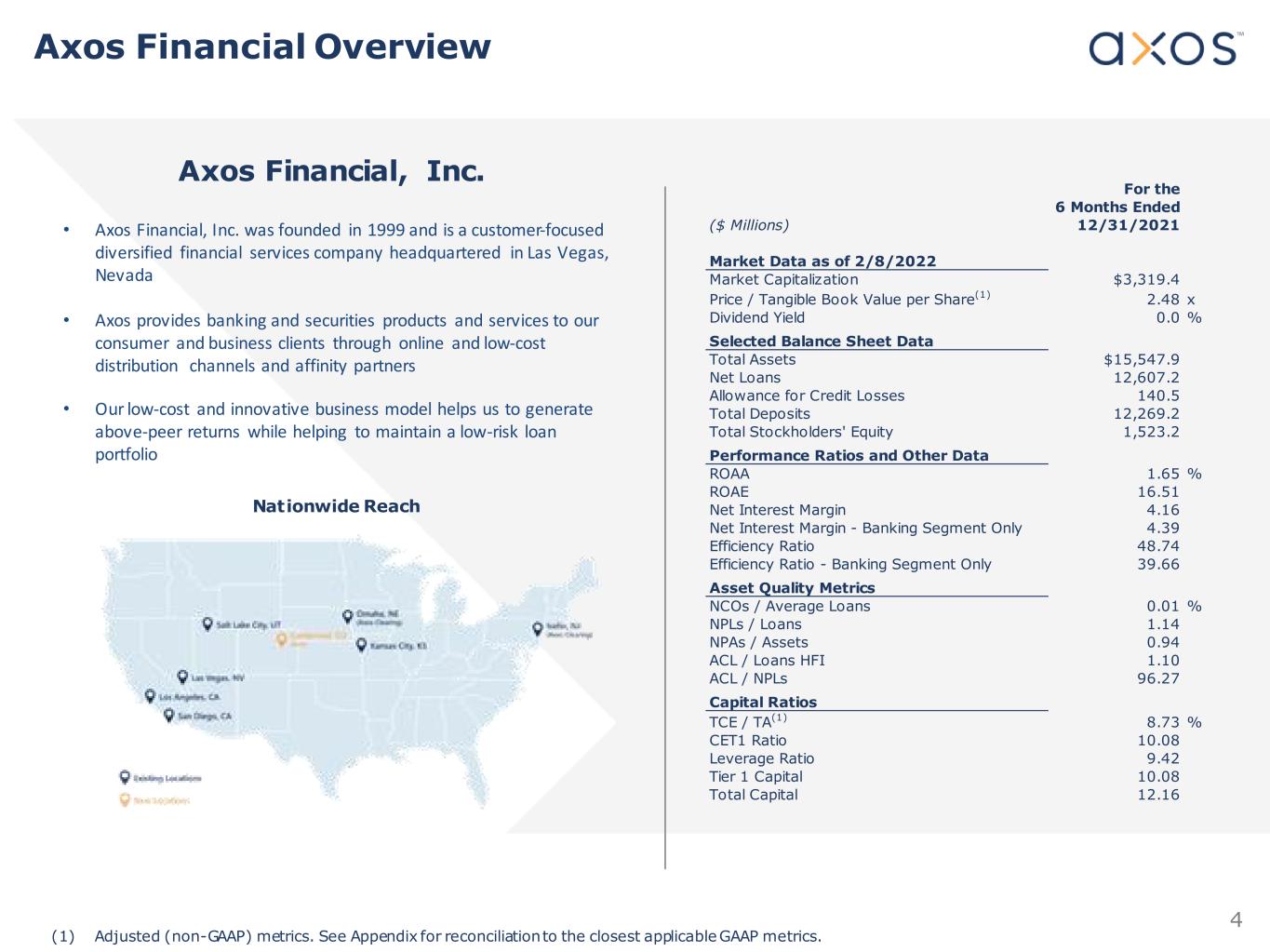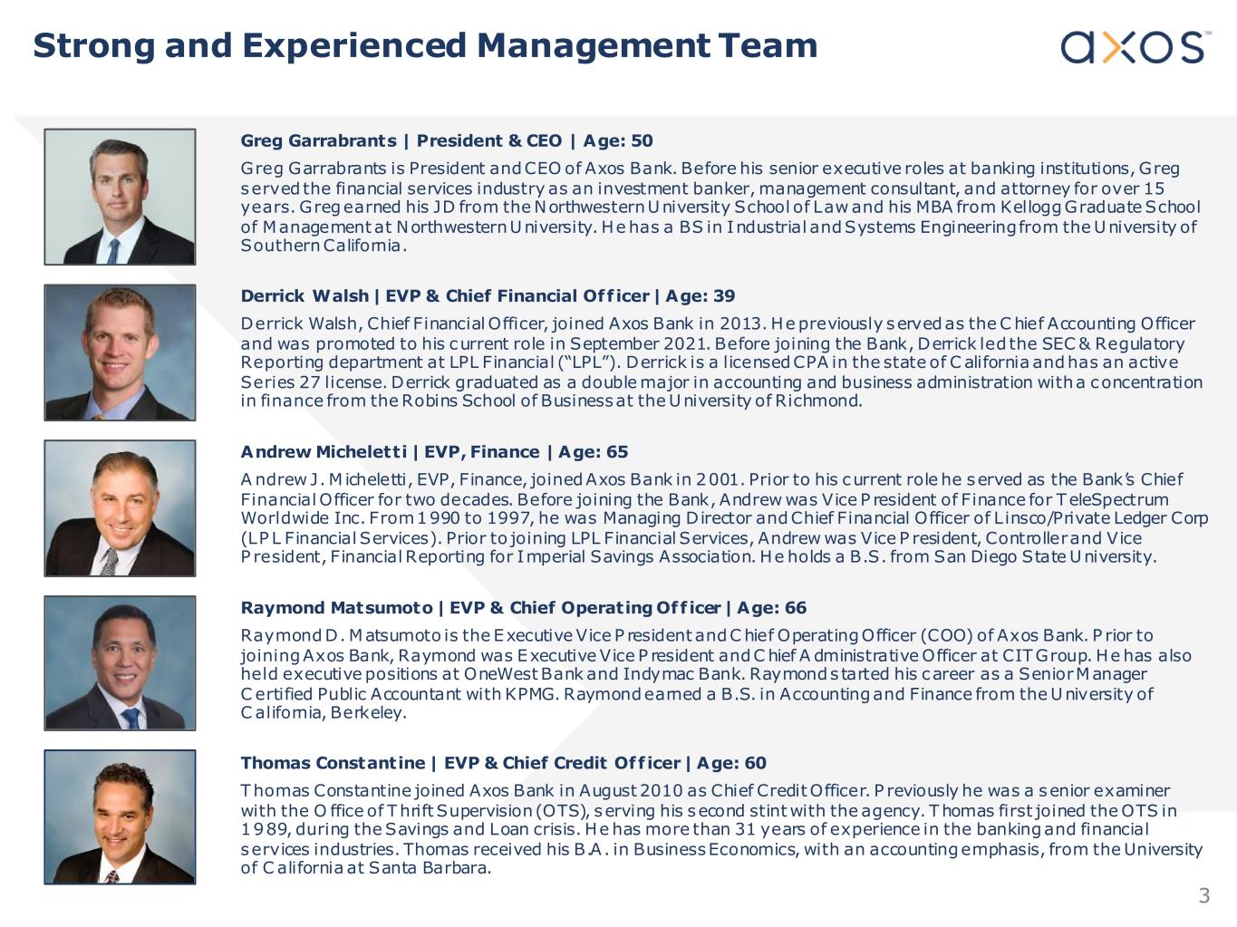 3 Greg Garrabrants | President & CEO | Age: 50 Greg Garrabrants is President and CEO of Axos Bank. Before his senior executive roles at banking institutions, Greg served the financial services industry as an investment banker, management consultant, and attorney for over 15 years. Greg earned his JD from the Northwestern University School of Law and his MBA from Kellogg Graduate School of Management at Northwestern University. He has a BS in Industrial and Systems Engineering from the University of Southern California. Andrew Micheletti | EVP, Finance | Age: 65 A ndrew J. M icheletti, EVP, Finance, joined Axos Bank in 2001. Prior to his current role he served as the Bank’s Chief Financial Officer for two decades. Before joining the Bank, Andrew was Vice P resident of Finance for TeleSpectrum Worldwide Inc. From 1990 to 1997, he was Managing Director and Chief Financial Officer of Linsco/Private Ledger Corp (LP L Financial Services). Prior to joining LPL Financial Services, Andrew was Vice P resident, Controller and Vice P resident, Financial Reporting for Imperial Savings Association. He holds a B.S. from San Diego State University. Raymond Matsumoto | EVP & Chief Operating Off icer | Age: 66 Raymond D. Matsumoto is the Executive Vice P resident and C hief Operating Officer (COO) of Axos Bank. P rior to joining Axos Bank, Raymond was Executive Vice P resident and C hief A dministrative Officer at CIT Group. He has also held executive positions at OneWest Bank and Indymac Bank. Raymond s tarted his career as a Senior Manager C ertified Public Accountant with KPMG. Raymond earned a B.S. in Accounting and Finance from the University of C alifornia, Berkeley. Strong and Experienced Management Team Thomas Constantine | EVP & Chief Credit Off icer | Age: 60 Thomas Constantine joined Axos Bank in August 2010 as Chief Credit Officer. P reviously he was a senior examiner with the O ffice of Thrift Supervision (OTS), serving his second stint with the agency. Thomas first joined the OTS in 1989, during the Savings and Loan crisis. He has more than 31 years of experience in the banking and financial services industries. Thomas received his B.A . in Business Economics, with an accounting emphasis, from the University of C alifornia at Santa Barbara. Derrick Walsh | EVP & Chief Financial Off icer | Age: 39 Derrick Walsh, Chief Financial Officer, joined Axos Bank in 2013. He previously served as the C hief Accounting Officer and was promoted to his current role in September 2021. Before joining the Bank, Derrick led the SEC & Regulatory Reporting department at LPL Financial (“LPL”). Derrick is a licensed CPA in the state of C alifornia and has an active Series 27 license. Derrick graduated as a double major in accounting and business administration with a concentration in finance from the Robins School of Business at the University of Richmond.