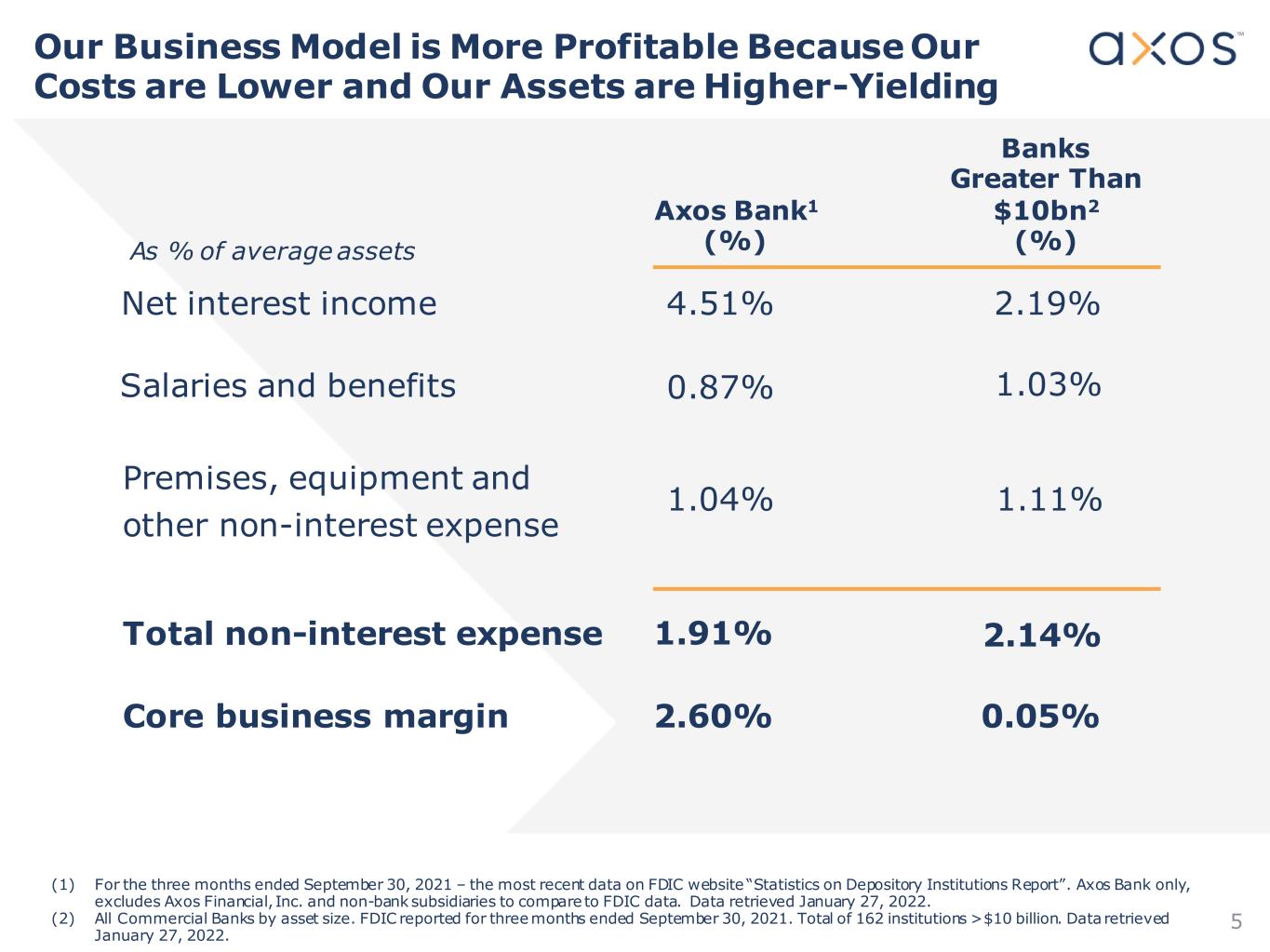 4 Axos Financial Overview Axos Financial, Inc. • Axos Financial, Inc. was founded in 1999 and is a customer-focused diversified financial services company headquartered in Las Vegas, Nevada • Axos provides banking and securities products and services to our consumer and business clients through online and low-cost distribution channels and affinity partners • Our low-cost and innovative business model helps us to generate above-peer returns while helping to maintain a low-risk loan portfolio (1) Adjusted (non-GAAP) metrics. See Appendix for reconciliation to the closest applicable GAAP metrics. For the 6 Months Ended ($ Millions) 12/31/2021 Market Data as of 2/8/2022 Market Capitalization $3,319.4 Price / Tangible Book Value per Share(1) 2.48 x Dividend Yield 0.0 % Selected Balance Sheet Data Total Assets $15,547.9 Net Loans 12,607.2 Allowance for Credit Losses 140.5 Total Deposits 12,269.2 Total Stockholders' Equity 1,523.2 Performance Ratios and Other Data ROAA 1.65 % ROAE 16.51 Net Interest Margin 4.16 Net Interest Margin - Banking Segment Only 4.39 Efficiency Ratio 48.74 Efficiency Ratio - Banking Segment Only 39.66 Asset Quality Metrics NCOs / Average Loans 0.01 % NPLs / Loans 1.14 NPAs / Assets 0.94 ACL / Loans HFI 1.10 ACL / NPLs 96.27 Capital Ratios TCE / TA(1) 8.73 % CET1 Ratio 10.08 Leverage Ratio 9.42 Tier 1 Capital 10.08 Total Capital 12.16 Nationwide Reach