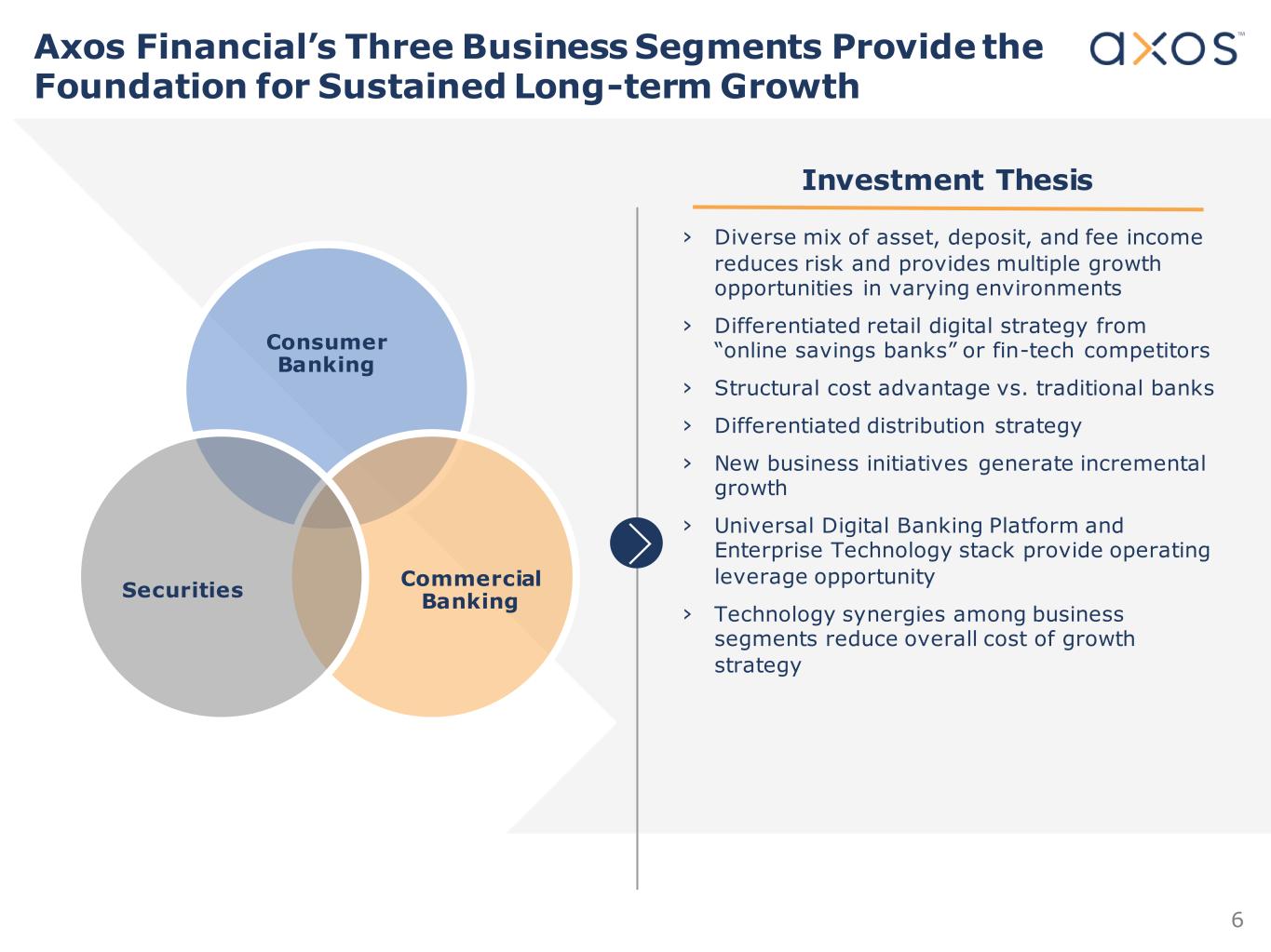 5 Axos Bank1 (%) Banks Greater Than $10bn2 (%) Net interest income 4.51% 2.19% As % of average assets Salaries and benefits 0.87% 1.03% Premises, equipment and other non-interest expense 1.04% 1.11% Total non-interest expense 1.91% 2.14% Core business margin 2.60% 0.05% Our Business Model is More Profitable Because Our Costs are Lower and Our Assets are Higher-Yielding (1) For the three months ended September 30, 2021 – the most recent data on FDIC website “Statistics on Depository Institutions Report”. Axos Bank only, excludes Axos Financial, Inc. and non-bank subsidiaries to compare to FDIC data. Data retrieved January 27, 2022. (2) All Commercial Banks by asset size. FDIC reported for three months ended September 30, 2021. Total of 162 institutions >$10 billion. Data retrieved January 27, 2022.