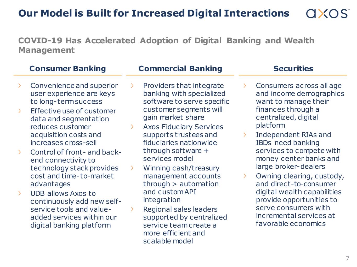 6 Consumer Banking Commercial Banking Securities Axos Financial’s Three Business Segments Provide the Foundation for Sustained Long-term Growth › Diverse mix of asset, deposit, and fee income reduces risk and provides multiple growth opportunities in varying environments › Differentiated retail digital strategy from “online savings banks” or fin-tech competitors › Structural cost advantage vs. traditional banks › Differentiated distribution strategy › New business initiatives generate incremental growth › Universal Digital Banking Platform and Enterprise Technology stack provide operating leverage opportunity › Technology synergies among business segments reduce overall cost of growth strategy Investment Thesis