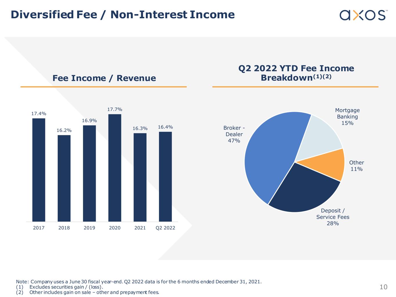 9 Return on Average Assets Return on Average Equity Efficiency Ratio 36.08% 39.58% 51.12% 47.50% 48.84% 48.74% 2017 2018 2019 2020 2021 Q2 2022 1.68% 1.68% 1.51% 1.53% 1.52% 1.65% 2017 2018 2019 2020 2021 Q2 2022 17.78% 17.05% 15.40% 15.65% 16.51% 16.51% 2017 2018 2019 2020 2021 Q2 2022 Note: Company uses a June 30 fiscal year-end. Q2 2022 data is for the 6 months ended December 31, 2021. (1) Securities segment added in third quarter of 2019. (2) The Company partnered with H&R Block Bank (HRB) to provide HRB branded financial services products. The partnership was terminated on December 8, 2020. Efficient Operations and Stable Margins Lead to Superior Profitability 3.90% 3.84% 3.76% 3.83% 3.92% 4.16% 1.60% 1.91% 2.40% 0.08% 0.10% 0.07% 2017 2018 2019 2020 2021 Q2 2022 NIM (Excluding HRB) Fed Funds Rate Net Interest Margin (2) (1)