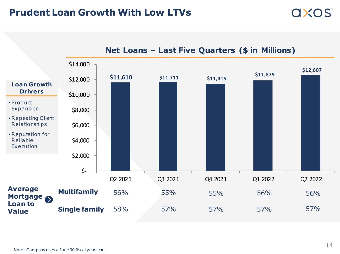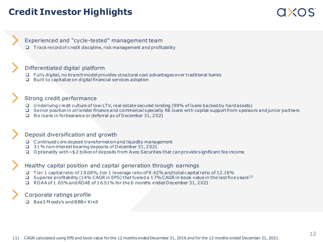 12 Credit Investor Highlights Experienced and “cycle-tested” management team T rack record of c redit discipline, risk management and profitability Differentiated digital platform Fully digital, no branch model provides structural cost advantages over traditional banks Built to capitalize on digital financial services adoption Strong credit performance Underlying c redit culture of low-LTV, real estate secured lending (99% of loans backed by hard assets) Senior position in all lender finance and commercial specialty RE loans with capital support from sponsors and junior partners No loans in forbearance or deferral as of December 31, 2021 Deposit diversification and growth C ontinued core deposit transformation and liquidity management 31% non-interest bearing deposits of December 31, 2021 O ptionality with ~$2 billion of deposits from Axos Securities that can provide s ignificant fee income Healthy capital position and capital generation through earnings T ier 1 capital ratio of 10.08%, tier 1 leverage ratio of 9 .42% and total capital ratio of 12.16% Superior profitability (14% CAGR in EPS) that fueled a 17% CAGR in book value in the last five years(1) ROAA of 1 .65% and ROAE of 16.51% for the 6 months ended December 31, 2021 Corporate ratings profile Baa3 Moody’s and BBB+ Kroll (1) CAGR calculated using EPS and book value for the 12 months ended December 31, 2016 and for the 12 months ended December 31, 2021.