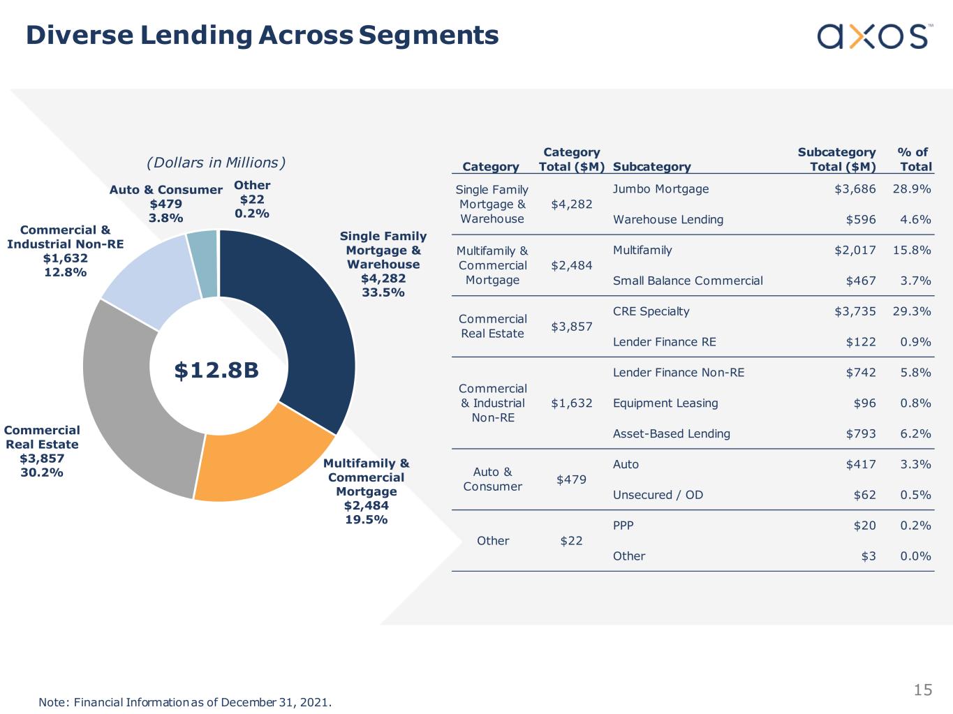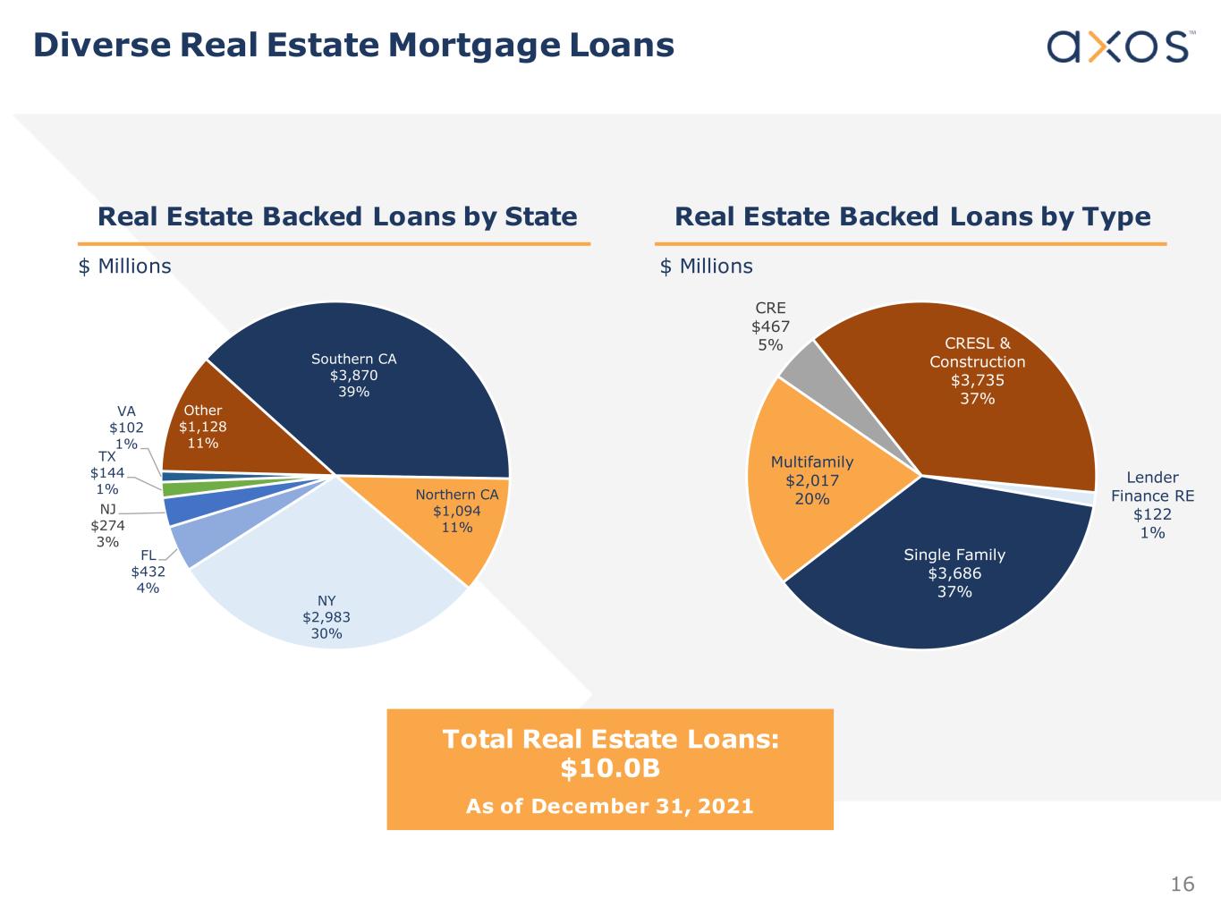 15 Single Family Mortgage & Warehouse $4,282 33.5% Multifamily & Commercial Mortgage $2,484 19.5% Commercial Real Estate $3,857 30.2% Commercial & Industrial Non-RE $1,632 12.8% Auto & Consumer $479 3.8% Other $22 0.2% Note: Financial Information as of December 31, 2021. $12.8B Diverse Lending Across Segments (Dollars in Millions) Category Subcategory % of Category Total ($M) Subcategory Total ($M) Total Jumbo Mortgage $3,686 28.9% Warehouse Lending $596 4.6% Multifamily $2,017 15.8% Small Balance Commercial $467 3.7% CRE Specialty $3,735 29.3% Lender Finance RE $122 0.9% Lender Finance Non-RE $742 5.8% Equipment Leasing $96 0.8% Asset-Based Lending $793 6.2% Auto $417 3.3% Unsecured / OD $62 0.5% PPP $20 0.2% Other $3 0.0% Other Auto & Consumer Commercial & Industrial Non-RE Multifamily & Commercial Mortgage Single Family Mortgage & Warehouse Commercial Real Estate $479 $1,632 $2,484 $4,282 $22 $3,857