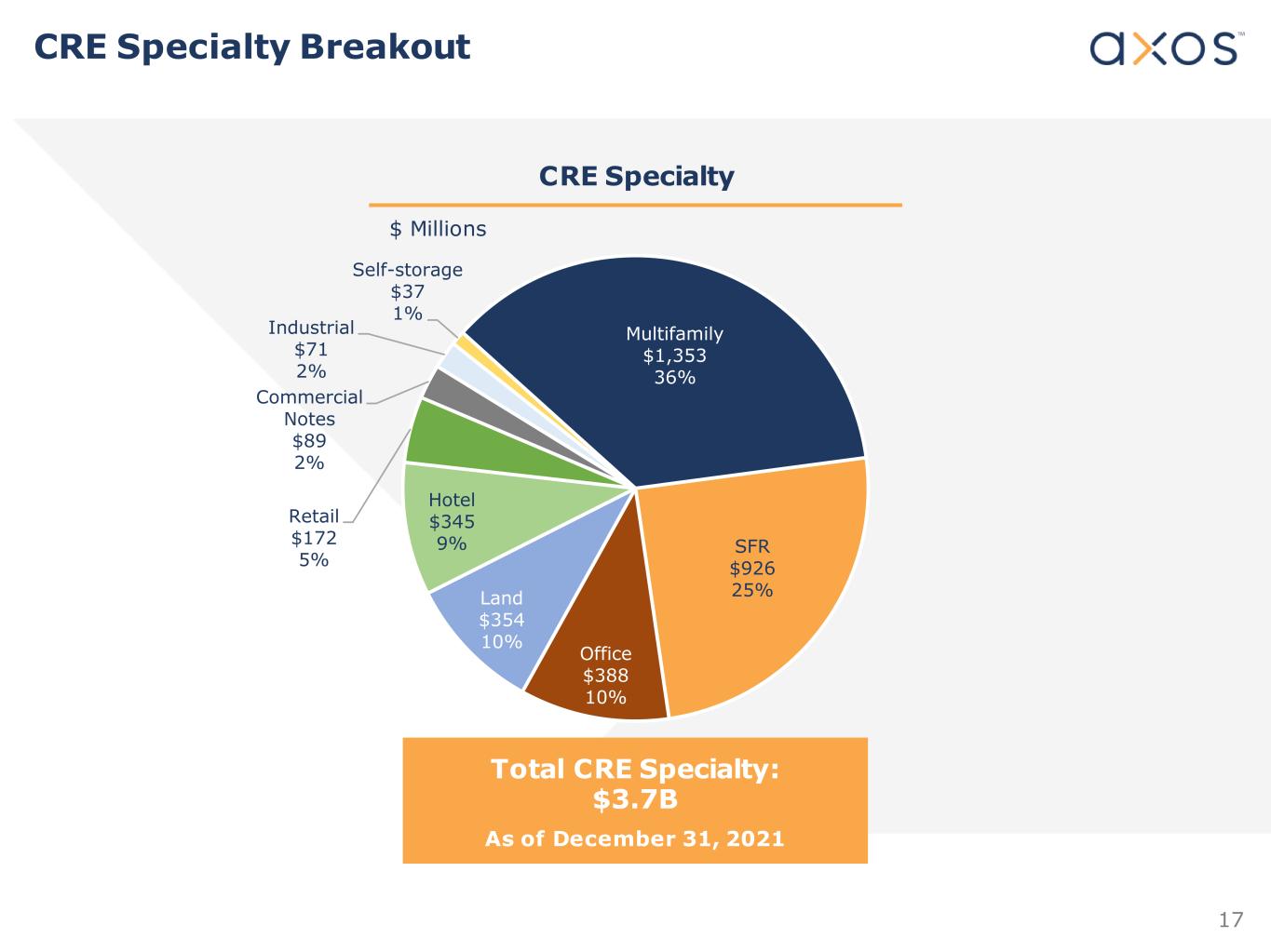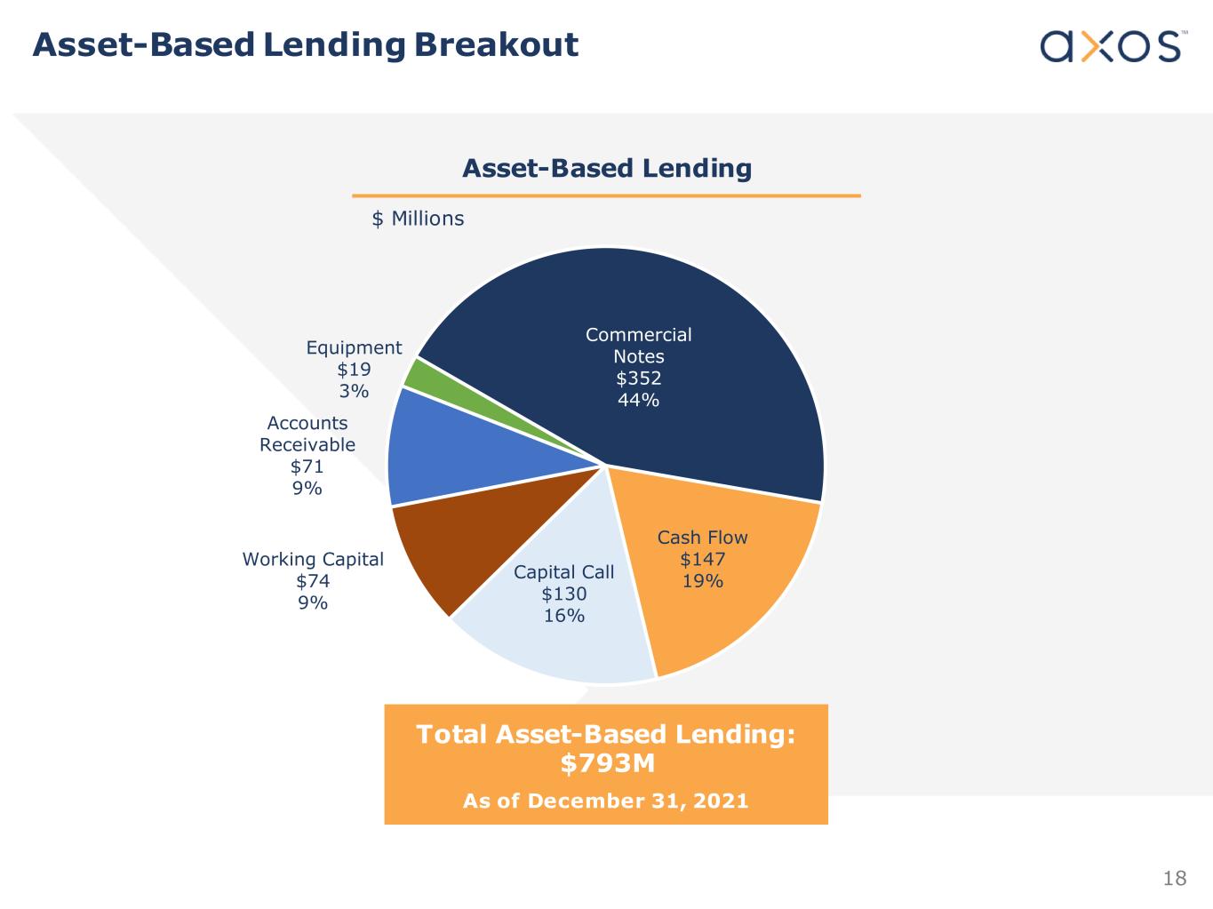 17 CRE Specialty CRE Specialty Breakout $ Millions Total CRE Specialty: $3.7B As of December 31, 2021 Multifamily $1,353 36% SFR $926 25% Office $388 10% Land $354 10% Hotel $345 9% Retail $172 5% Commercial Notes $89 2% Industrial $71 2% Self-storage $37 1%