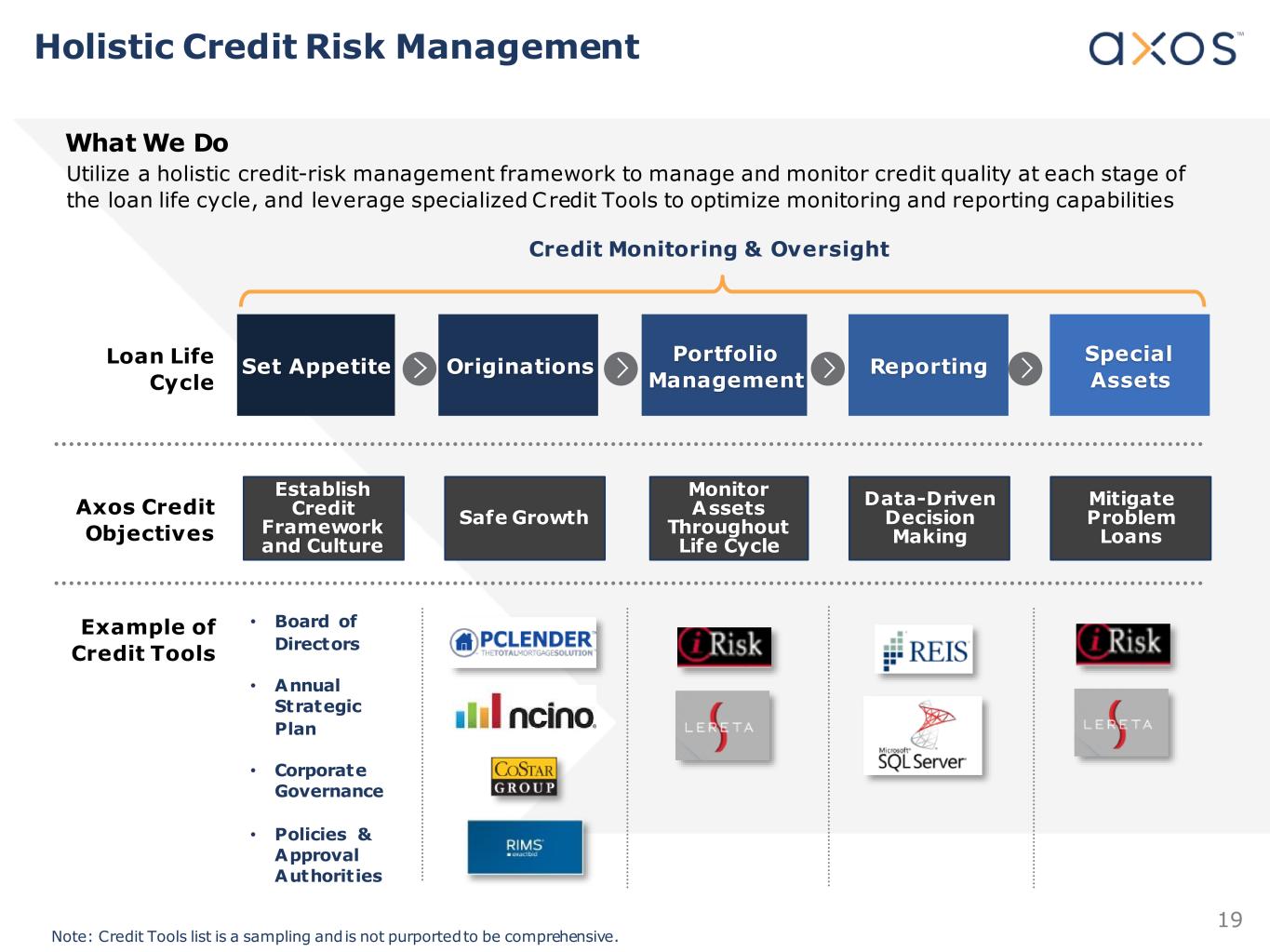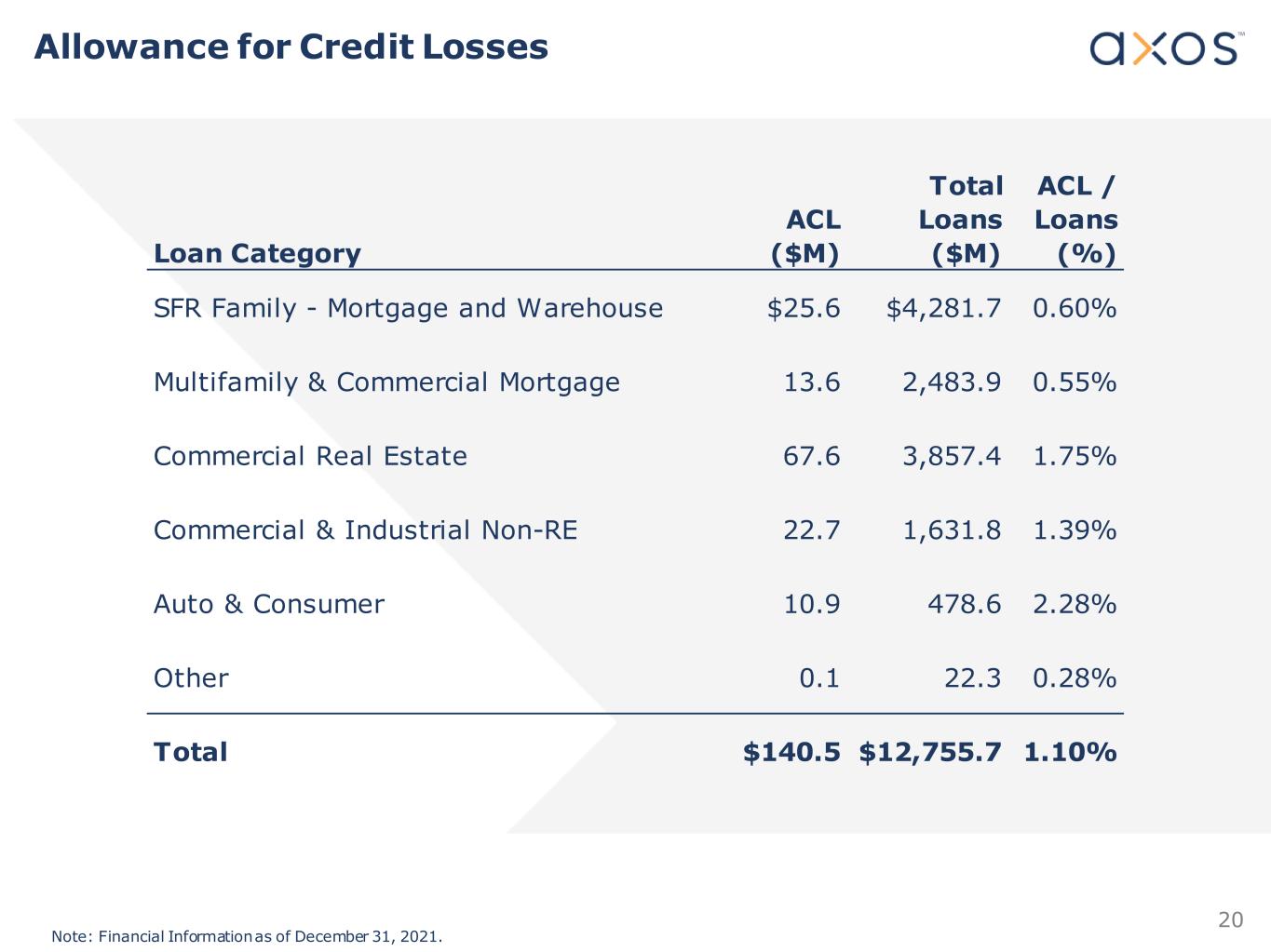 19 Holistic Credit Risk Management What We Do Loan Life Cycle Utilize a holistic credit-risk management framework to manage and monitor credit quality at each stage of the loan life cycle, and leverage specialized Credit Tools to optimize monitoring and reporting capabilities Set Appetite Originations Portfolio Management Reporting Special Assets Credit Monitoring & Oversight Axos Credit Objectives Establish Credit Framework and Culture Safe Growth Monitor Assets Throughout Life Cycle Data-Driven Decision Making Mitigate Problem Loans Example of Credit Tools • Board of Directors • Annual Strategic Plan • Corporate Governance • Policies & Approval Authorities Note: Credit Tools list is a sampling and is not purported to be comprehensive.