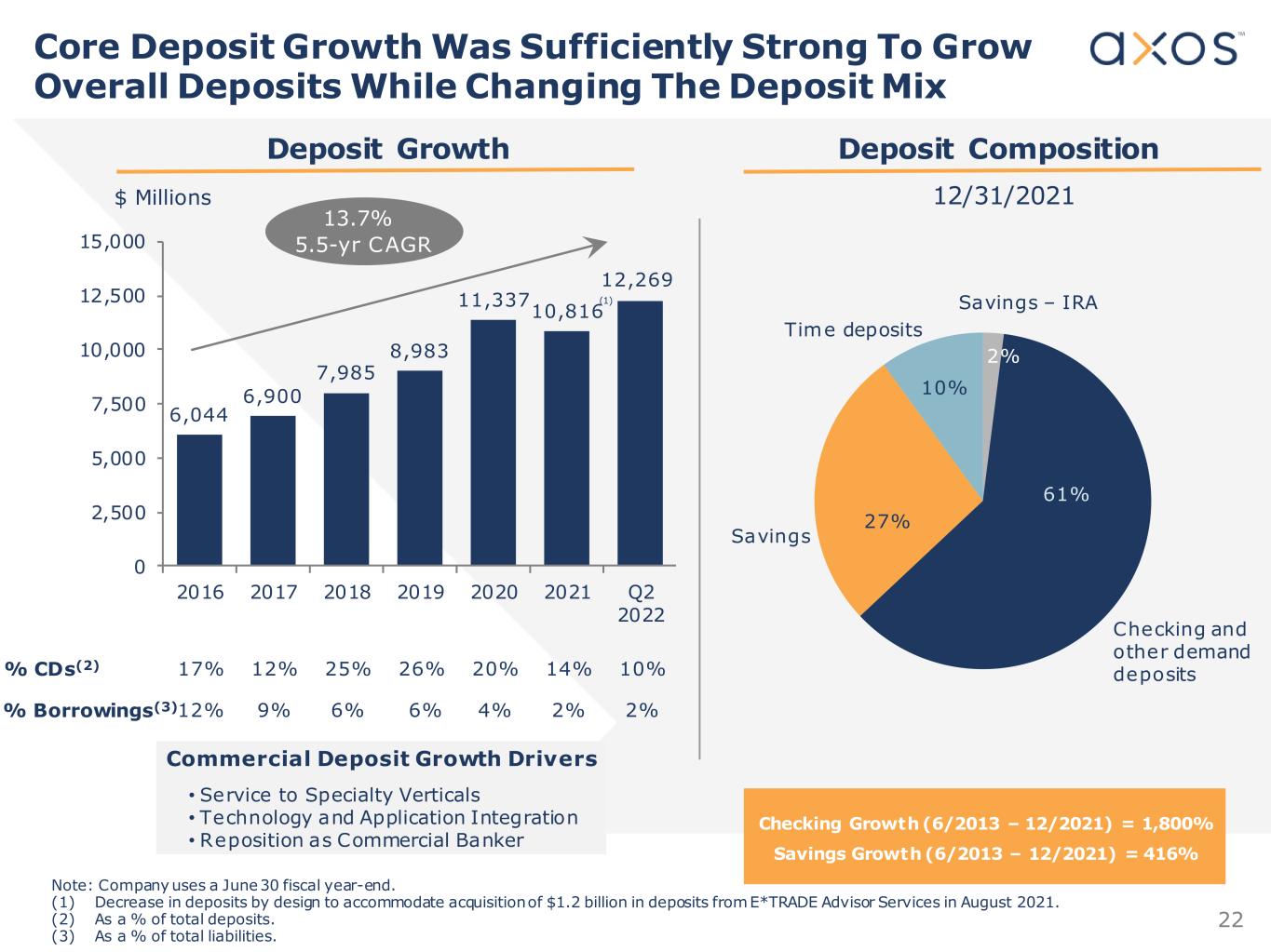22 • Service to Specialty Verticals • Technology and Application Integration • Reposition as Commercial Banker Deposit Composition Note: Company uses a June 30 fiscal year-end. (1) Decrease in deposits by design to accommodate acquisition of $1.2 billion in deposits from E*TRADE Advisor Services in August 2021. (2) As a % of total deposits. (3) As a % of total liabilities. Checking Growth (6/2013 – 12/2021) = 1,800% Savings Growth (6/2013 – 12/2021) = 416% 12/31/2021 Deposit Growth 6,044 6,900 7,985 8,983 11,337 10,816 12,269 0 2,500 5,000 7,500 10,000 12,500 15,000 2016 2017 2018 2019 2020 2021 Q2 2022 $ Millions 13.7% 5.5-yr CAGR % CDs(2) % Borrowings(3) 17% 12% 12% 9% 25% 6% 26% 6% 20% 4% 14% 2% (1) Commercial Deposit Growth Drivers Checking and other demand deposits Savings Time deposits Savings – IRA 27% 10% 2% 61%% 10% 2% Core Deposit Growth Was Sufficiently Strong To Grow Overall Deposits While Changing The Deposit Mix
