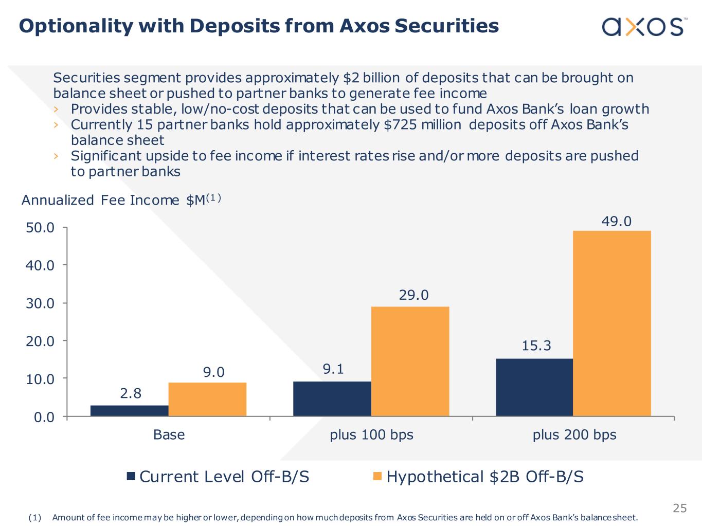 24 Consumer Direct Distribution Partners Small Business Banking Commercial / Treasury Management Axos Securities Specialty Deposits Fiduciary Services Diversified Deposit Gathering Business Lines ‹ Full service digital banking, wealth management, and securities trading ‹ Exclusive relationships with s ignificant brands, groups, or employers ‹ Exclusive relationships with brokers and financial planners through Axos Clearing and Axos A dvisor ‹ Bus iness banking with s imple suite of cash management services ‹ Fiduciary services for trustees ‹ 1031 exchange firms ‹ T itle and escrow companies ‹ HOA and property management ‹ Serves 40% of U .S. Chapter 7 bankruptcy trus tees in exclusive relationship ‹ Software allows servicing of SEC receivers and non-chapter 7 cases ‹ Full service treasury/cash management ‹ Team enhancements and geographic expansion ‹ Bank and securities cross-sell ‹ Broker-dealer c lient cash ‹ Broker-dealer reserve accounts $1.2B $1.2 $4.7B $1.1B $0.5B $2.2B $1.4B(1) Diversified Deposit Gathering (1) There is an additional $725 million off balance sheet.