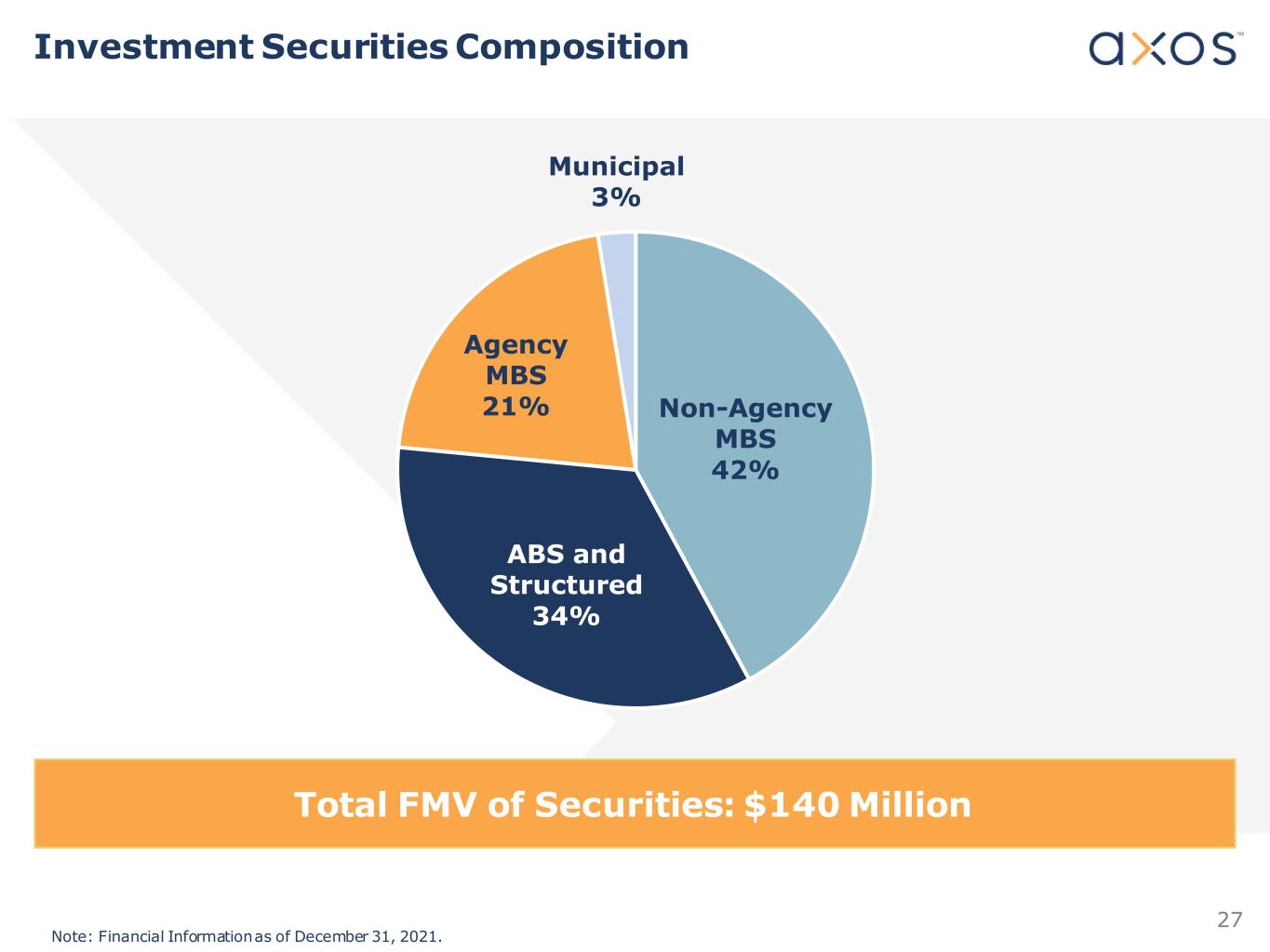 27 Total FMV of Securities: $140 Million Non-Agency MBS 42% ABS and Structured 34% Agency MBS 21% Municipal 3% Investment Securities Composition Note: Financial Information as of December 31, 2021.