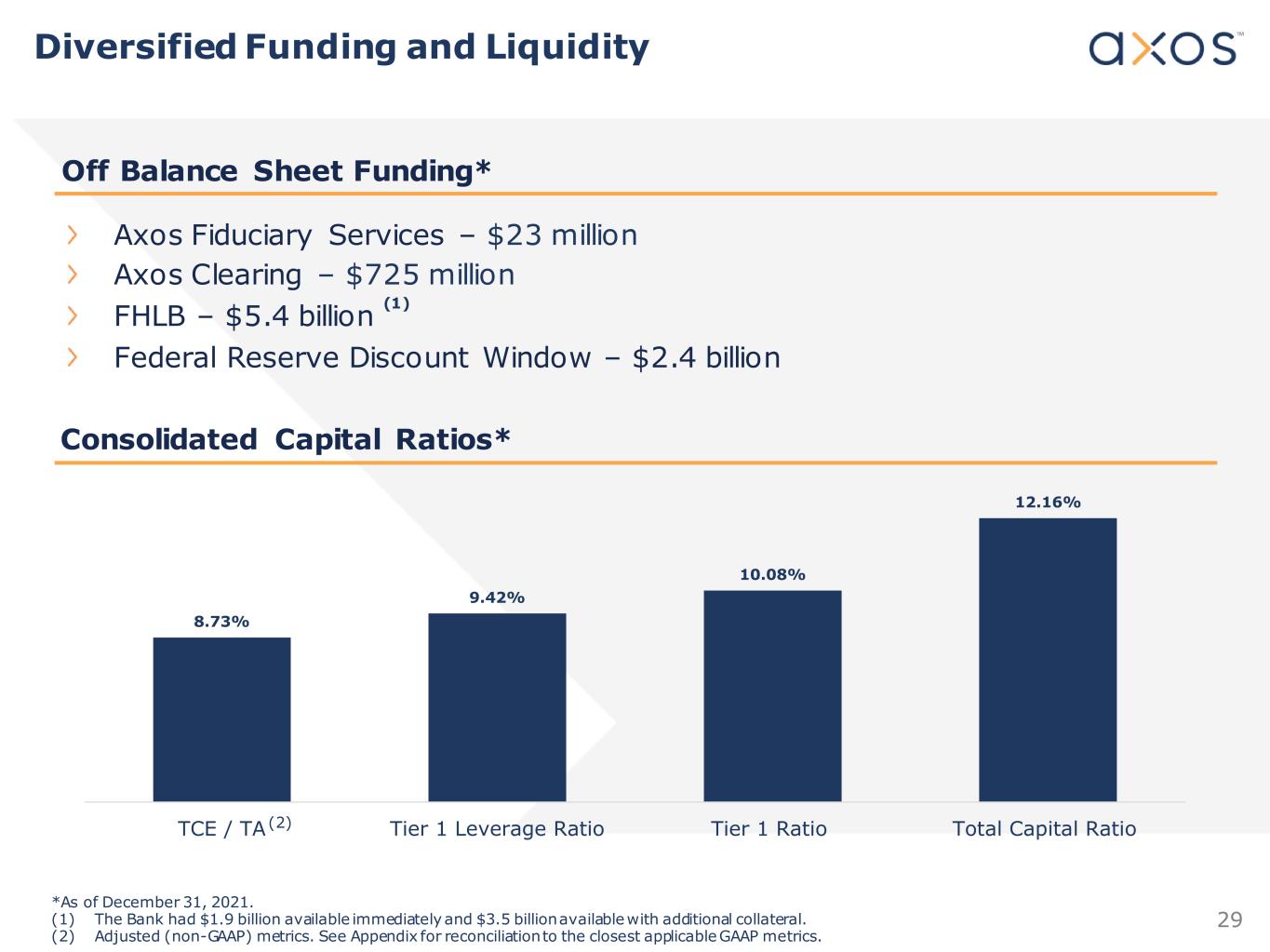 29 Off Balance Sheet Funding* 8.73% 9.42% 10.08% 12.16% TCE / TA Tier 1 Leverage Ratio Tier 1 Ratio Total Capital Ratio Axos Fiduciary Services – $23 million Axos Clearing – $725 million FHLB – $5.4 billion Federal Reserve Discount Window – $2.4 billion Consolidated Capital Ratios* (2) *As of December 31, 2021. (1) The Bank had $1.9 billion available immediately and $3.5 billion available with additional collateral. (2) Adjusted (non-GAAP) metrics. See Appendix for reconciliation to the closest applicable GAAP metrics. Diversified Funding and Liquidity (1)