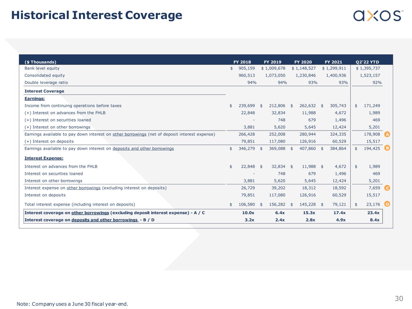 30 Note: Company uses a June 30 fiscal year-end. ($ Thousands) FY 2018 FY 2019 FY 2020 FY 2021 Q2'22 YTD Bank level equity 905,159$ 1,009,678$ 1,148,527$ 1,299,911$ 1,395,737$ Consolidated equity 960,513 1,073,050 1,230,846 1,400,936 1,523,157 Double leverage ratio 94% 94% 93% 93% 92% Interest Coverage Earnings: Income from continuing operations before taxes 239,699$ 212,806$ 262,632$ 305,743$ 171,249$ (+) Interest on advances from the FHLB 22,848 32,834 11,988 4,672 1,989 (+) Interest on securities loaned - 748 679 1,496 469 (+) Interest on other borrowings 3,881 5,620 5,645 12,424 5,201 Earnings available to pay down interest on other borrowings (net of deposit interest expense) 266,428 252,008 280,944 324,335 178,908 (+) Interest on deposits 79,851 117,080 126,916 60,529 15,517 Earnings available to pay down interest on deposits and other borrowings 346,279$ 369,088$ 407,860$ 384,864$ 194,425$ Interest Expense: Interest on advances from the FHLB 22,848$ 32,834$ 11,988$ 4,672$ 1,989$ Interest on securities loaned - 748 679 1,496 469 Interest on other borrowings 3,881 5,620 5,645 12,424 5,201 Interest expense on other borrowings (excluding interest on deposits) 26,729 39,202 18,312 18,592 7,659 Interest on deposits 79,851 117,080 126,916 60,529 15,517 Total interest expense (including interest on deposits) 106,580$ 156,282$ 145,228$ 79,121$ 23,176$ Interest coverage on other borrowings (excluding deposit interest expense) - A / C 10.0x 6.4x 15.3x 17.4x 23.4x Interest coverage on deposits and other borrowings - B / D 3.2x 2.4x 2.8x 4.9x 8.4x B D A C Historical Interest Coverage