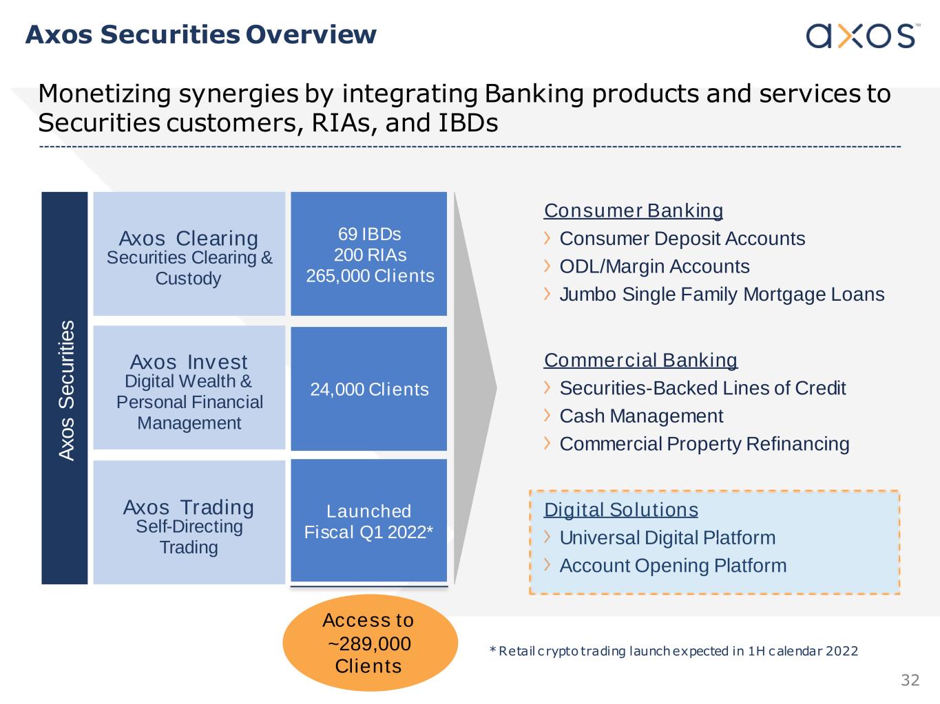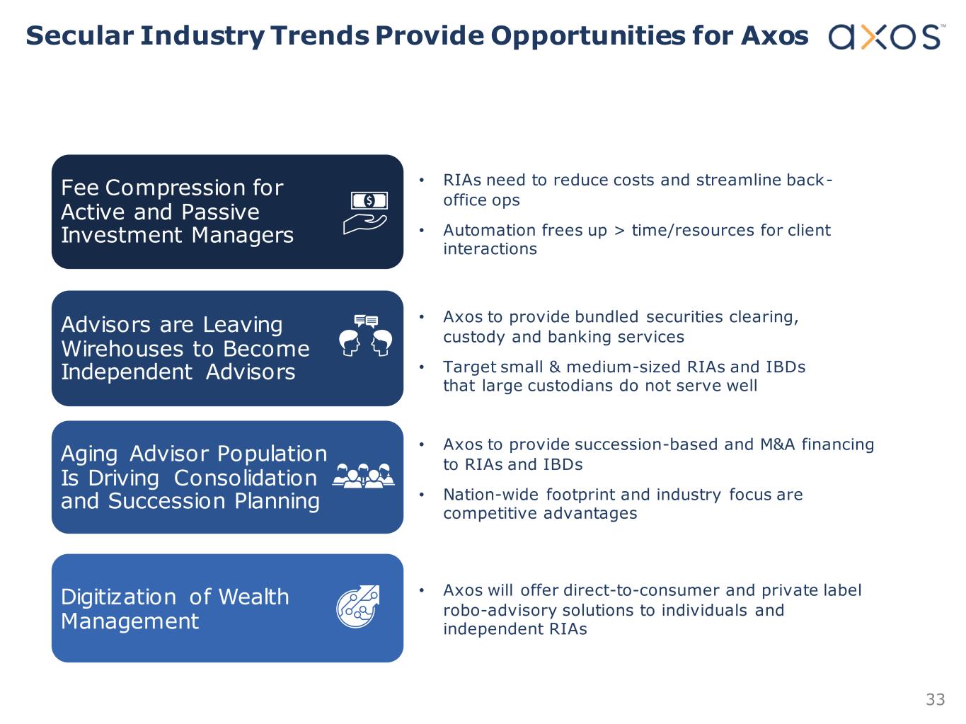 32 Axos Clearing Securities Clearing & Custody Axos Invest Digital Wealth & Personal Financial Management Axos Trading Self-Directing Trading A xo s S e c u ri tie s 69 IBDs 200 RIAs 265,000 Clients 24,000 Clients Launched Fiscal Q1 2022* Consumer Banking Consumer Deposit Accounts ODL/Margin Accounts Jumbo Single Family Mortgage Loans Commercial Banking Securities-Backed Lines of Credit Cash Management Commercial Property Refinancing Digital Solutions Universal Digital Platform Account Opening Platform Access to ~289,000 Clients Monetizing synergies by integrating Banking products and services to Securities customers, RIAs, and IBDs . *Retail c rypto trading launch expected in 1H calendar 2022 Axos Securities Overview