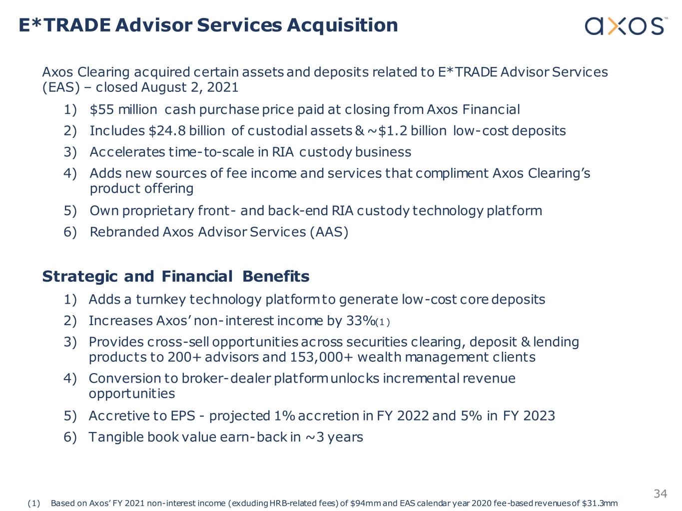 33 Secular Industry Trends Provide Opportunities for Axos Fee Compression for Active and Passive Investment Managers Advisors are Leaving Wirehouses to Become Independent Advisors Aging Advisor Population Is Driving Consolidation and Succession Planning Digitization of Wealth Management • RIAs need to reduce costs and streamline back- office ops • Automation frees up > time/resources for client interactions • Axos to provide bundled securities clearing, custody and banking services • Target small & medium-sized RIAs and IBDs that large custodians do not serve well • Axos to provide succession-based and M&A financing to RIAs and IBDs • Nation-wide footprint and industry focus are competitive advantages • Axos will offer direct-to-consumer and private label robo-advisory solutions to individuals and independent RIAs