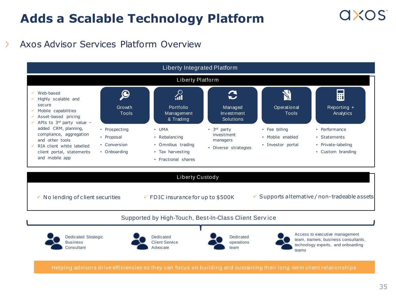 34 Axos Clearing acquired certain assets and deposits related to E*TRADE Advisor Services (EAS) – closed August 2, 2021 1) $55 million cash purchase price paid at closing from Axos Financial 2) Includes $24.8 billion of custodial assets & ~$1.2 billion low-cost deposits 3) Accelerates time-to-scale in RIA custody business 4) Adds new sources of fee income and services that compliment Axos Clearing’s product offering 5) Own proprietary front- and back-end RIA custody technology platform 6) Rebranded Axos Advisor Services (AAS) Strategic and Financial Benefits 1) Adds a turnkey technology platform to generate low-cost core deposits 2) Increases Axos’ non-interest income by 33%(1) 3) Provides cross-sell opportunities across securities clearing, deposit & lending products to 200+ advisors and 153,000+ wealth management clients 4) Conversion to broker-dealer platform unlocks incremental revenue opportunities 5) Accretive to EPS - projected 1% accretion in FY 2022 and 5% in FY 2023 6) Tangible book value earn-back in ~3 years (1) Based on Axos’ FY 2021 non-interest income (excluding HRB-related fees) of $94mm and EAS calendar year 2020 fee-based revenues of $31.3mm E*TRADE Advisor Services Acquisition