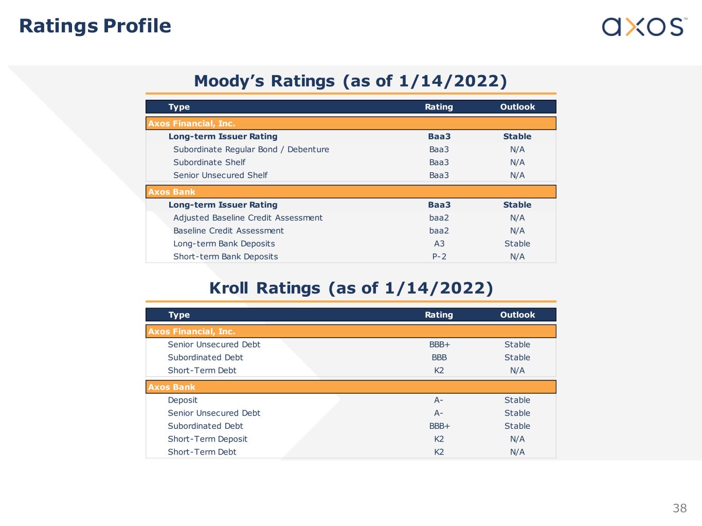 38 Type Rating Outlook Axos Financial, Inc. Senior Unsecured Debt BBB+ Stable Subordinated Debt BBB Stable Short-Term Debt K2 N/A Axos Bank Deposit A- Stable Senior Unsecured Debt A- Stable Subordinated Debt BBB+ Stable Short-Term Deposit K2 N/A Short-Term Debt K2 N/A Type Rating Outlook Axos Financial, Inc. Long-term Issuer Rating Baa3 Stable Subordinate Regular Bond / Debenture Baa3 N/A Subordinate Shelf Baa3 N/A Senior Unsecured Shelf Baa3 N/A Axos Bank Long-term Issuer Rating Baa3 Stable Adjusted Baseline Credit Assessment baa2 N/A Baseline Credit Assessment baa2 N/A Long-term Bank Deposits A3 Stable Short-term Bank Deposits P-2 N/A Moody’s Ratings (as of 1/14/2022) Kroll Ratings (as of 1/14/2022) Ratings Profile