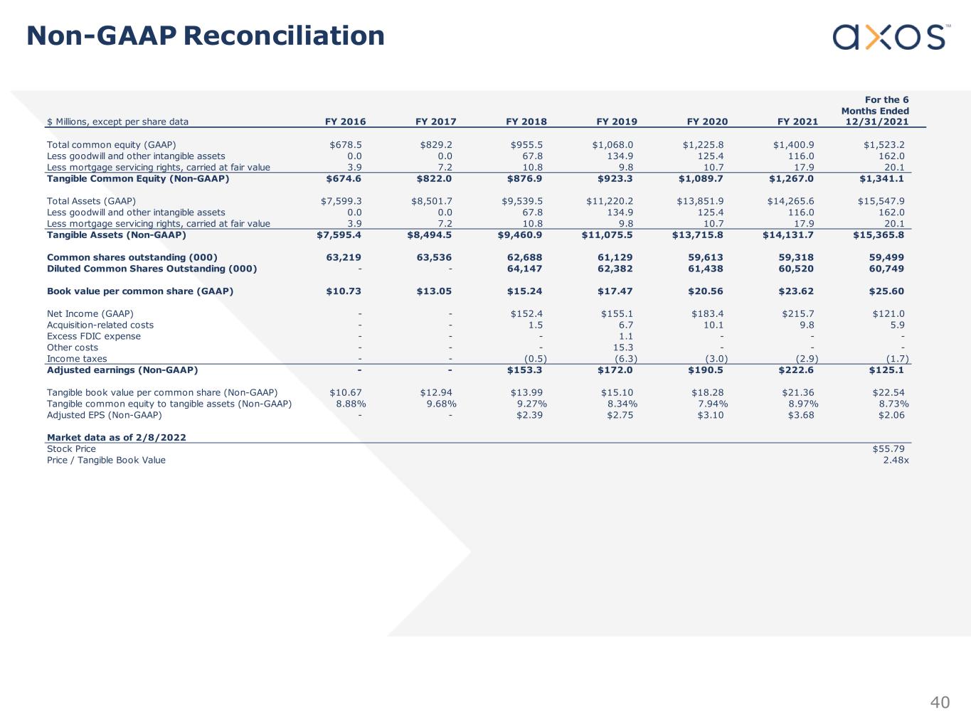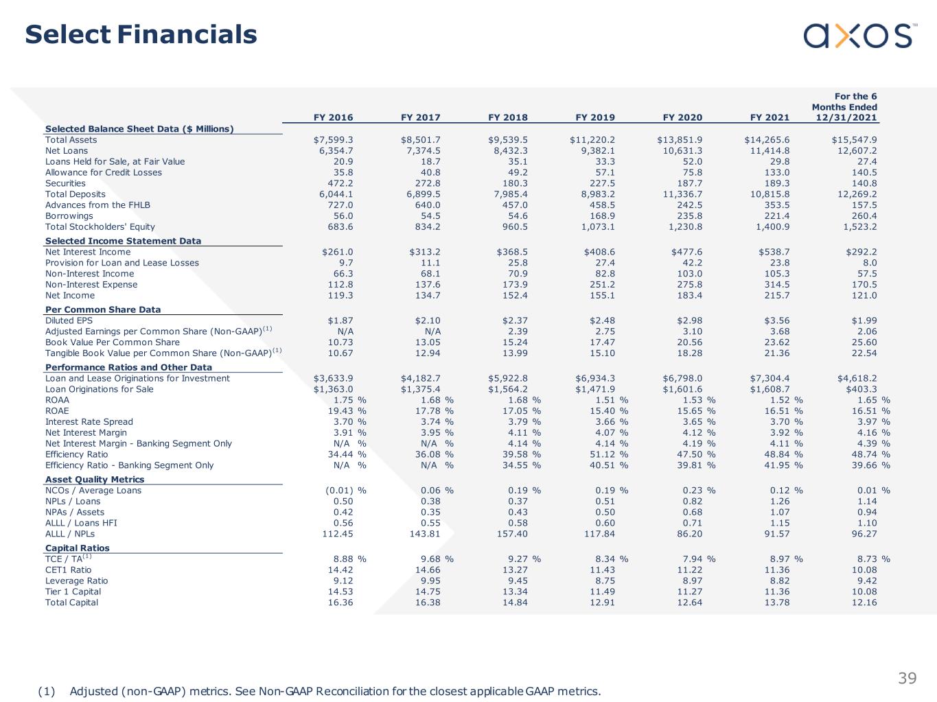 39 (1) Adjusted (non-GAAP) metrics. See Non-GAAP Reconciliation for the closest applicable GAAP metrics. For the 6 Months Ended FY 2016 FY 2017 FY 2018 FY 2019 FY 2020 FY 2021 12/31/2021 Selected Balance Sheet Data ($ Millions) Total Assets $7,599.3 $8,501.7 $9,539.5 $11,220.2 $13,851.9 $14,265.6 $15,547.9 Net Loans 6,354.7 7,374.5 8,432.3 9,382.1 10,631.3 11,414.8 12,607.2 Loans Held for Sale, at Fair Value 20.9 18.7 35.1 33.3 52.0 29.8 27.4 Allowance for Credit Losses 35.8 40.8 49.2 57.1 75.8 133.0 140.5 Securities 472.2 272.8 180.3 227.5 187.7 189.3 140.8 Total Deposits 6,044.1 6,899.5 7,985.4 8,983.2 11,336.7 10,815.8 12,269.2 Advances from the FHLB 727.0 640.0 457.0 458.5 242.5 353.5 157.5 Borrowings 56.0 54.5 54.6 168.9 235.8 221.4 260.4 Total Stockholders' Equity 683.6 834.2 960.5 1,073.1 1,230.8 1,400.9 1,523.2 Selected Income Statement Data Net Interest Income $261.0 $313.2 $368.5 $408.6 $477.6 $538.7 $292.2 Provision for Loan and Lease Losses 9.7 11.1 25.8 27.4 42.2 23.8 8.0 Non-Interest Income 66.3 68.1 70.9 82.8 103.0 105.3 57.5 Non-Interest Expense 112.8 137.6 173.9 251.2 275.8 314.5 170.5 Net Income 119.3 134.7 152.4 155.1 183.4 215.7 121.0 Per Common Share Data Diluted EPS $1.87 $2.10 $2.37 $2.48 $2.98 $3.56 $1.99 Adjusted Earnings per Common Share (Non-GAAP)(1) N/A N/A 2.39 2.75 3.10 3.68 2.06 Book Value Per Common Share 10.73 13.05 15.24 17.47 20.56 23.62 25.60 Tangible Book Value per Common Share (Non-GAAP)(1) 10.67 12.94 13.99 15.10 18.28 21.36 22.54 Performance Ratios and Other Data Loan and Lease Originations for Investment $3,633.9 $4,182.7 $5,922.8 $6,934.3 $6,798.0 $7,304.4 $4,618.2 Loan Originations for Sale $1,363.0 $1,375.4 $1,564.2 $1,471.9 $1,601.6 $1,608.7 $403.3 ROAA 1.75 % 1.68 % 1.68 % 1.51 % 1.53 % 1.52 % 1.65 % ROAE 19.43 % 17.78 % 17.05 % 15.40 % 15.65 % 16.51 % 16.51 % Interest Rate Spread 3.70 % 3.74 % 3.79 % 3.66 % 3.65 % 3.70 % 3.97 % Net Interest Margin 3.91 % 3.95 % 4.11 % 4.07 % 4.12 % 3.92 % 4.16 % Net Interest Margin - Banking Segment Only N/A % N/A % 4.14 % 4.14 % 4.19 % 4.11 % 4.39 % Efficiency Ratio 34.44 % 36.08 % 39.58 % 51.12 % 47.50 % 48.84 % 48.74 % Efficiency Ratio - Banking Segment Only N/A % N/A % 34.55 % 40.51 % 39.81 % 41.95 % 39.66 % Asset Quality Metrics NCOs / Average Loans (0.01) % 0.06 % 0.19 % 0.19 % 0.23 % 0.12 % 0.01 % NPLs / Loans 0.50 0.38 0.37 0.51 0.82 1.26 1.14 NPAs / Assets 0.42 0.35 0.43 0.50 0.68 1.07 0.94 ALLL / Loans HFI 0.56 0.55 0.58 0.60 0.71 1.15 1.10 ALLL / NPLs 112.45 143.81 157.40 117.84 86.20 91.57 96.27 Capital Ratios TCE / TA(1) 8.88 % 9.68 % 9.27 % 8.34 % 7.94 % 8.97 % 8.73 % CET1 Ratio 14.42 14.66 13.27 11.43 11.22 11.36 10.08 Leverage Ratio 9.12 9.95 9.45 8.75 8.97 8.82 9.42 Tier 1 Capital 14.53 14.75 13.34 11.49 11.27 11.36 10.08 Total Capital 16.36 16.38 14.84 12.91 12.64 13.78 12.16 Select Financials