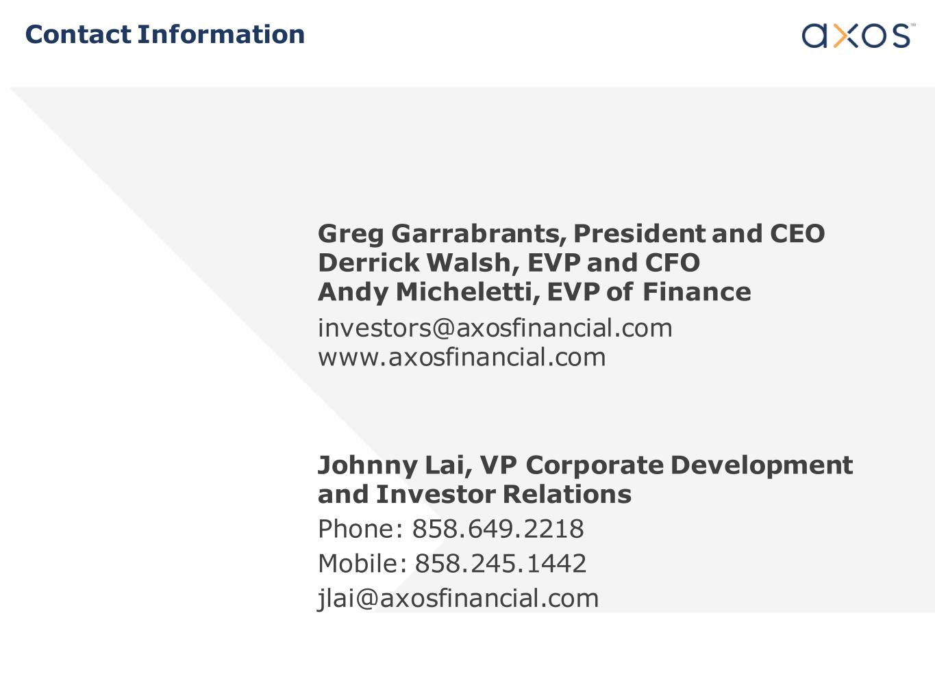Contact Information Greg Garrabrants, President and CEO Derrick Walsh, EVP and CFO Andy Micheletti, EVP of Finance investors@axosfinancial.com www.axosfinancial.com Johnny Lai, VP Corporate Development and Investor Relations Phone: 858.649.2218 Mobile: 858.245.1442 jlai@axosfinancial.com