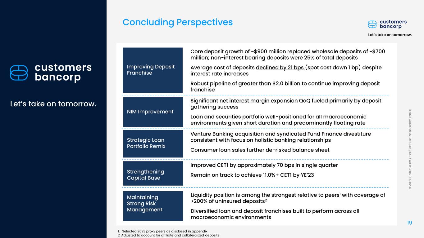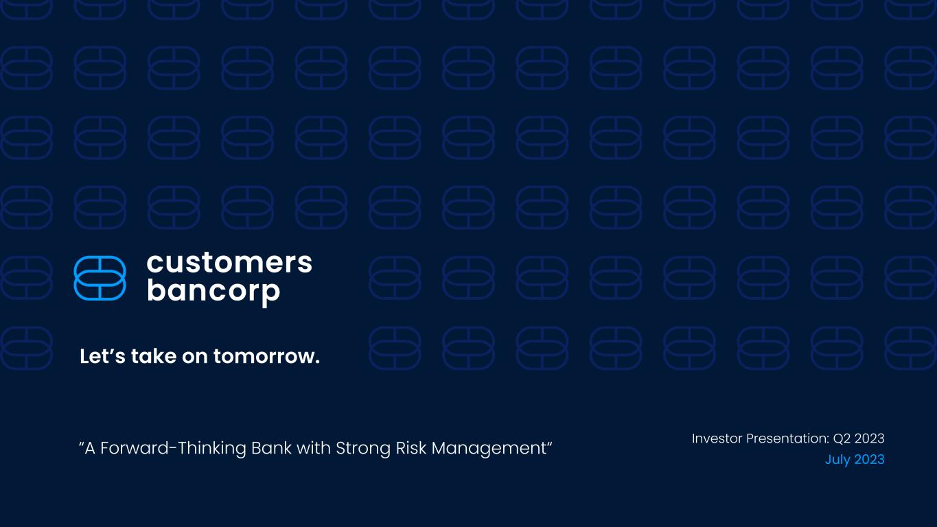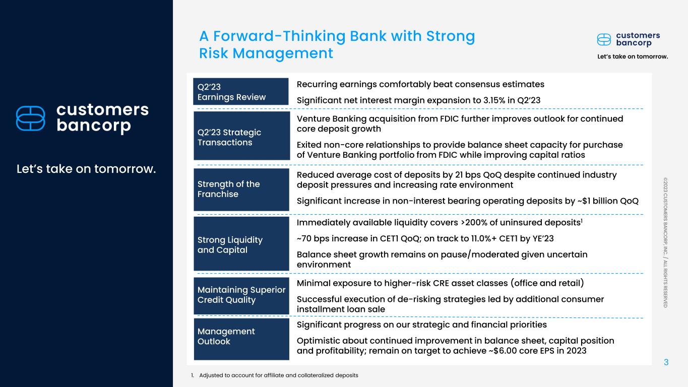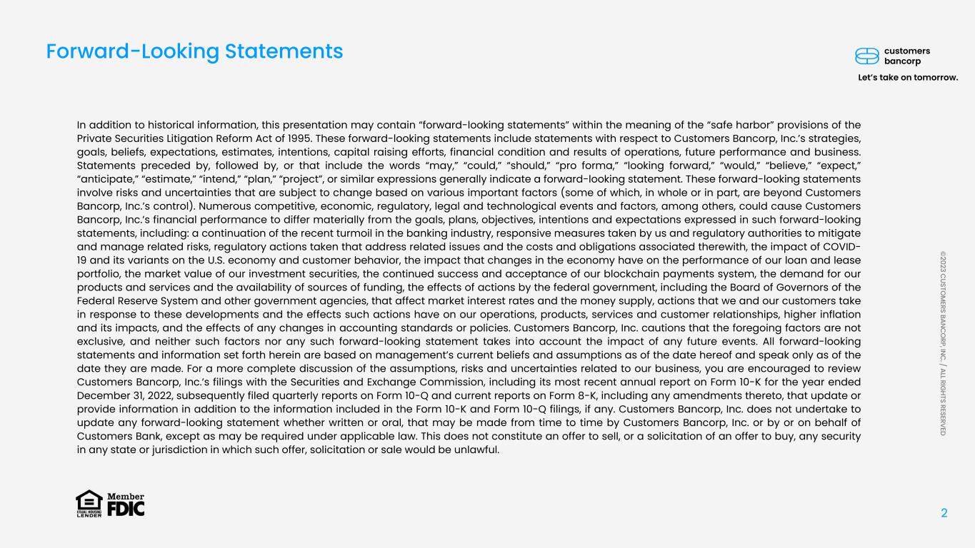 2 Let’s take on tomorrow. customers bancorp © 2023 C USTO M ERS BANC O RP, INC . / ALL RIG HTS RESERVED In addition to historical information, this presentation may contain “forward-looking statements” within the meaning of the “safe harbor” provisions of the Private Securities Litigation Reform Act of 1995. These forward-looking statements include statements with respect to Customers Bancorp, Inc.’s strategies, goals, beliefs, expectations, estimates, intentions, capital raising efforts, financial condition and results of operations, future performance and business. Statements preceded by, followed by, or that include the words “may,” “could,” “should,” “pro forma,” “looking forward,” “would,” “believe,” “expect,” “anticipate,” “estimate,” “intend,” “plan,” “project”, or similar expressions generally indicate a forward-looking statement. These forward-looking statements involve risks and uncertainties that are subject to change based on various important factors (some of which, in whole or in part, are beyond Customers Bancorp, Inc.’s control). Numerous competitive, economic, regulatory, legal and technological events and factors, among others, could cause Customers Bancorp, Inc.’s financial performance to differ materially from the goals, plans, objectives, intentions and expectations expressed in such forward-looking statements, including: a continuation of the recent turmoil in the banking industry, responsive measures taken by us and regulatory authorities to mitigate and manage related risks, regulatory actions taken that address related issues and the costs and obligations associated therewith, the impact of COVID- 19 and its variants on the U.S. economy and customer behavior, the impact that changes in the economy have on the performance of our loan and lease portfolio, the market value of our investment securities, the continued success and acceptance of our blockchain payments system, the demand for our products and services and the availability of sources of funding, the effects of actions by the federal government, including the Board of Governors of the Federal Reserve System and other government agencies, that affect market interest rates and the money supply, actions that we and our customers take in response to these developments and the effects such actions have on our operations, products, services and customer relationships, higher inflation and its impacts, and the effects of any changes in accounting standards or policies. Customers Bancorp, Inc. cautions that the foregoing factors are not exclusive, and neither such factors nor any such forward-looking statement takes into account the impact of any future events. All forward-looking statements and information set forth herein are based on management’s current beliefs and assumptions as of the date hereof and speak only as of the date they are made. For a more complete discussion of the assumptions, risks and uncertainties related to our business, you are encouraged to review Customers Bancorp, Inc.’s filings with the Securities and Exchange Commission, including its most recent annual report on Form 10-K for the year ended December 31, 2022, subsequently filed quarterly reports on Form 10-Q and current reports on Form 8-K, including any amendments thereto, that update or provide information in addition to the information included in the Form 10-K and Form 10-Q filings, if any. Customers Bancorp, Inc. does not undertake to update any forward-looking statement whether written or oral, that may be made from time to time by Customers Bancorp, Inc. or by or on behalf of Customers Bank, except as may be required under applicable law. This does not constitute an offer to sell, or a solicitation of an offer to buy, any security in any state or jurisdiction in which such offer, solicitation or sale would be unlawful. Forward-Looking Statements