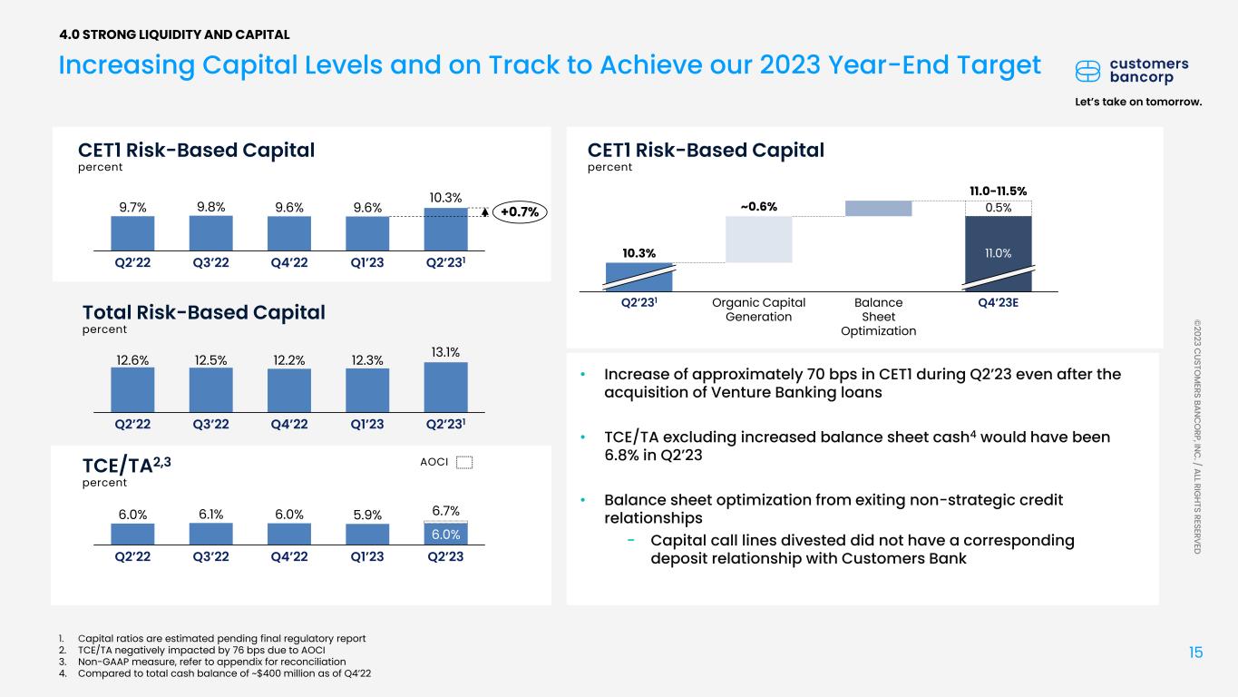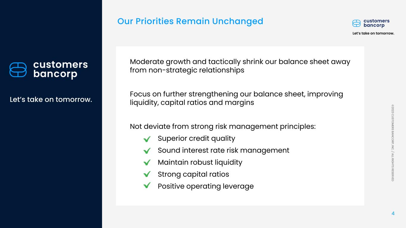 3 Let’s take on tomorrow. © 2023 C USTO M ERS BANC O RP, INC . / ALL RIG HTS RESERVED Recurring earnings comfortably beat consensus estimates Significant net interest margin expansion to 3.15% in Q2’23 Q2’23 Strategic Transactions Strength of the Franchise Maintaining Superior Credit Quality Strong Liquidity and Capital Immediately available liquidity covers >200% of uninsured deposits1 ~70 bps increase in CET1 QoQ; on track to 11.0%+ CET1 by YE’23 Balance sheet growth remains on pause/moderated given uncertain environment Minimal exposure to higher-risk CRE asset classes (office and retail) Successful execution of de-risking strategies led by additional consumer installment loan sale Reduced average cost of deposits by 21 bps QoQ despite continued industry deposit pressures and increasing rate environment Significant increase in non-interest bearing operating deposits by ~$1 billion QoQ Venture Banking acquisition from FDIC further improves outlook for continued core deposit growth Exited non-core relationships to provide balance sheet capacity for purchase of Venture Banking portfolio from FDIC while improving capital ratios Management Outlook Significant progress on our strategic and financial priorities Optimistic about continued improvement in balance sheet, capital position and profitability; remain on target to achieve ~$6.00 core EPS in 2023 Q2’23 Earnings Review Let’s take on tomorrow. A Forward-Thinking Bank with Strong Risk Management 1. Adjusted to account for affiliate and collateralized deposits
