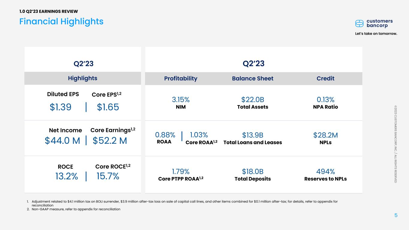 4 Let’s take on tomorrow. © 2023 C USTO M ERS BANC O RP, INC . / ALL RIG HTS RESERVED Let’s take on tomorrow. Our Priorities Remain Unchanged Moderate growth and tactically shrink our balance sheet away from non-strategic relationships Focus on further strengthening our balance sheet, improving liquidity, capital ratios and margins Not deviate from strong risk management principles: − Superior credit quality − Sound interest rate risk management − Maintain robust liquidity − Strong capital ratios − Positive operating leverage