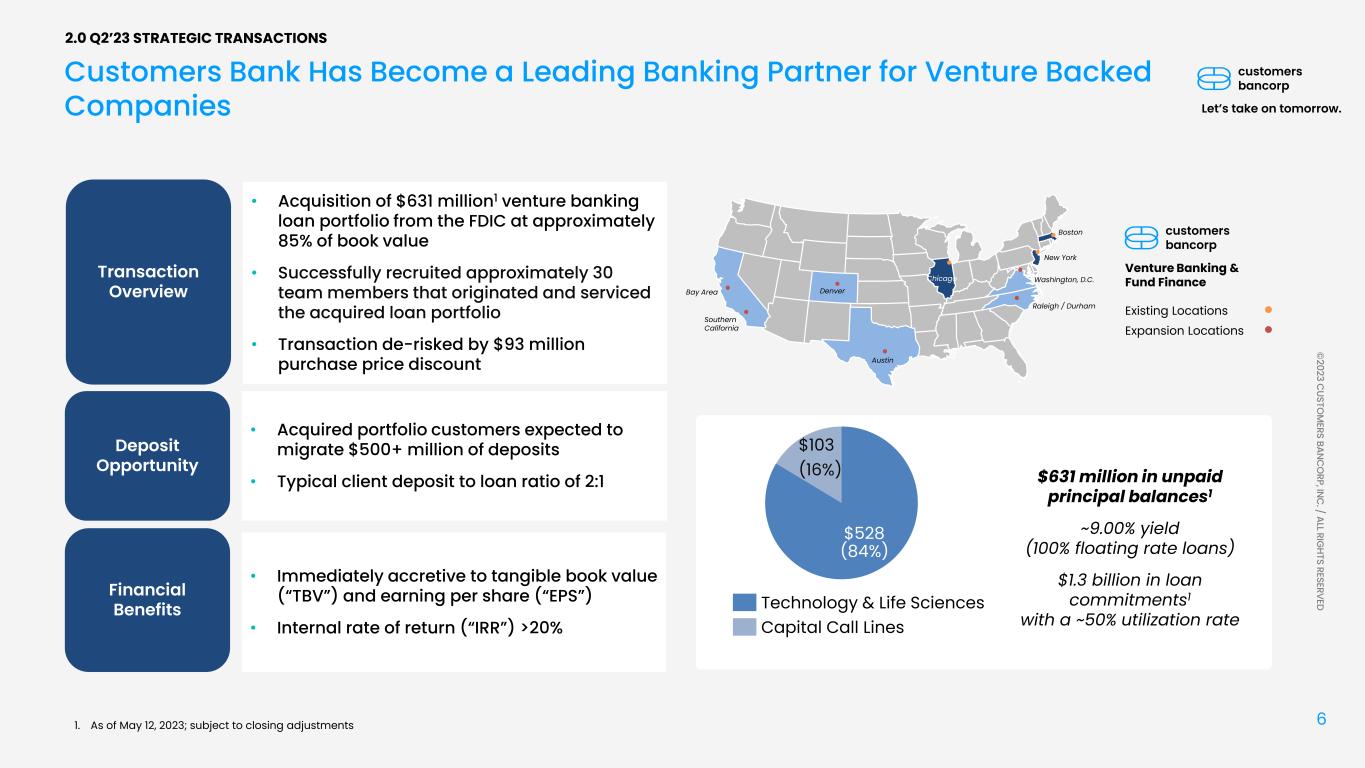 5 Let’s take on tomorrow. © 2023 C USTO M ERS BANC O RP, INC . / ALL RIG HTS RESERVED Q2’23 Profitability Balance Sheet Credit 3.15% NIM $22.0B Total Assets 0.13% NPA Ratio $13.9B Total Loans and Leases $28.2M NPLs 1.79% Core PTPP ROAA1,2 $18.0B Total Deposits 494% Reserves to NPLs Financial Highlights 1. Adjustment related to $4.1 million tax on BOLI surrender, $3.9 million after-tax loss on sale of capital call lines, and other items combined for $0.1 million after-tax; for details, refer to appendix for reconciliation 2. Non-GAAP measure, refer to appendix for reconciliation Highlights Q2’23 $1.65 Core EPS1,2 $52.2 M Core Earnings1,2 Core ROCE1,2 15.7% 1.0 Q2’23 EARNINGS REVIEW $1.39 Diluted EPS $44.0 M Net Income ROCE 13.2% ROAA 0.88% Core ROAA1,2 1.03%