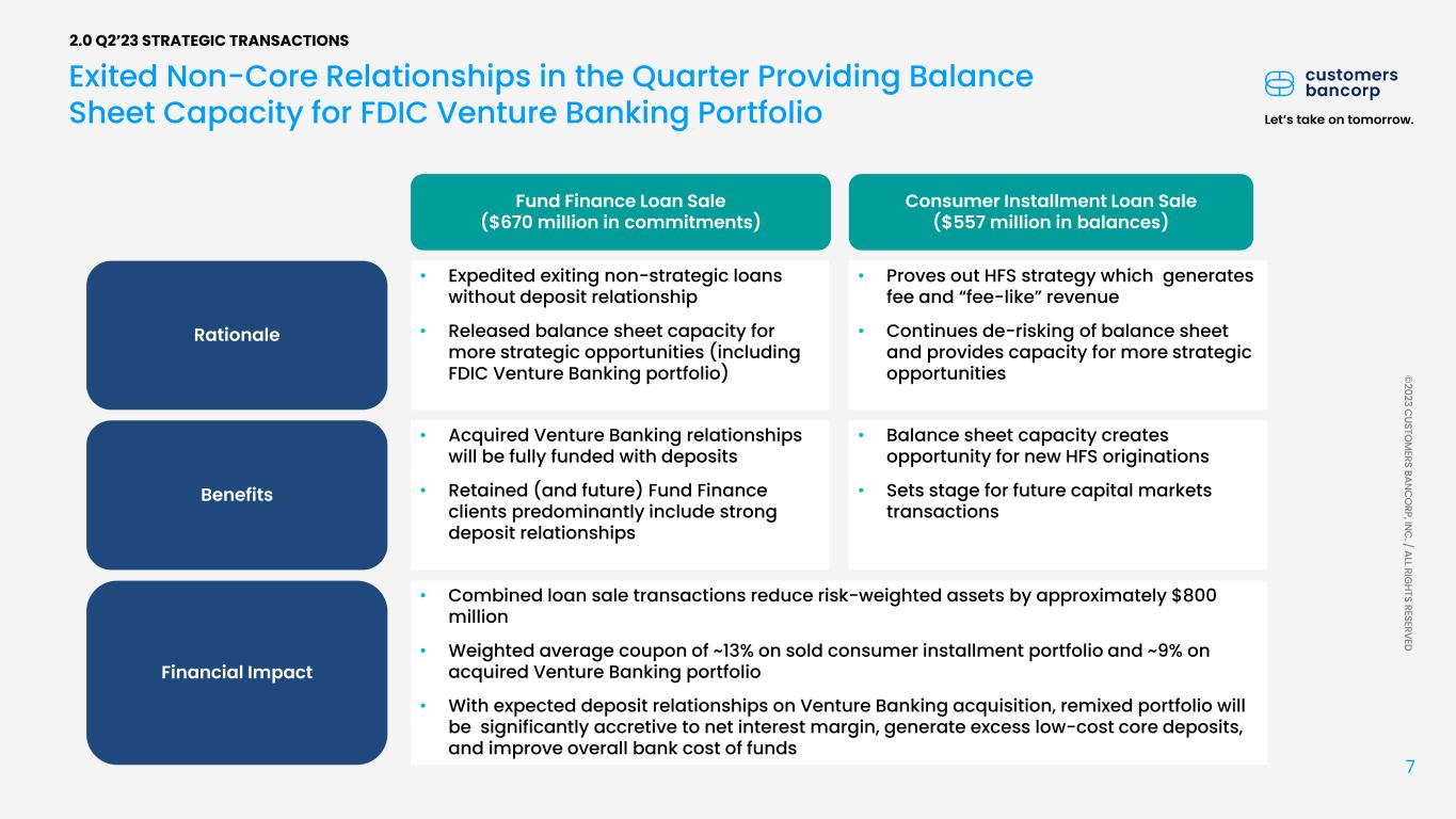 6 Let’s take on tomorrow. customers bancorp © 2023 C USTO M ERS BANC O RP, INC . / ALL RIG HTS RESERVED Customers Bank Has Become a Leading Banking Partner for Venture Backed Companies 2.0 Q2’23 STRATEGIC TRANSACTIONS Venture Banking & Fund Finance Existing Locations Expansion Locations Denver Austin Bay Area Southern California Chicago Raleigh / Durham Boston Washington, D.C. New York $631 million in unpaid principal balances1 ~9.00% yield (100% floating rate loans) $1.3 billion in loan commitments1 with a ~50% utilization rate Transaction Overview • Acquisition of $631 million1 venture banking loan portfolio from the FDIC at approximately 85% of book value • Successfully recruited approximately 30 team members that originated and serviced the acquired loan portfolio • Transaction de-risked by $93 million purchase price discount Deposit Opportunity • Acquired portfolio customers expected to migrate $500+ million of deposits • Typical client deposit to loan ratio of 2:1 Financial Benefits • Immediately accretive to tangible book value (“TBV”) and earning per share (“EPS”) • Internal rate of return (“IRR”) >20% 1. As of May 12, 2023; subject to closing adjustments $528 (84%) Technology & Life Sciences Capital Call Lines customers bancorp $103 (16%)