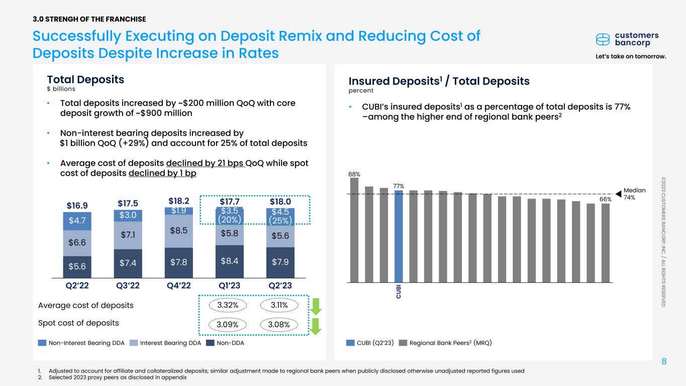 7 Let’s take on tomorrow. © 2023 C USTO M ERS BANC O RP, INC . / ALL RIG HTS RESERVED Exited Non-Core Relationships in the Quarter Providing Balance Sheet Capacity for FDIC Venture Banking Portfolio Rationale • Expedited exiting non-strategic loans without deposit relationship • Released balance sheet capacity for more strategic opportunities (including FDIC Venture Banking portfolio) • Proves out HFS strategy which generates fee and “fee-like” revenue • Continues de-risking of balance sheet and provides capacity for more strategic opportunities Benefits • Acquired Venture Banking relationships will be fully funded with deposits • Retained (and future) Fund Finance clients predominantly include strong deposit relationships • Balance sheet capacity creates opportunity for new HFS originations • Sets stage for future capital markets transactions Fund Finance Loan Sale ($670 million in commitments) Consumer Installment Loan Sale ($557 million in balances) Financial Impact • Combined loan sale transactions reduce risk-weighted assets by approximately $800 million • Weighted average coupon of ~13% on sold consumer installment portfolio and ~9% on acquired Venture Banking portfolio • With expected deposit relationships on Venture Banking acquisition, remixed portfolio will be significantly accretive to net interest margin, generate excess low-cost core deposits, and improve overall bank cost of funds 2.0 Q2’23 STRATEGIC TRANSACTIONS