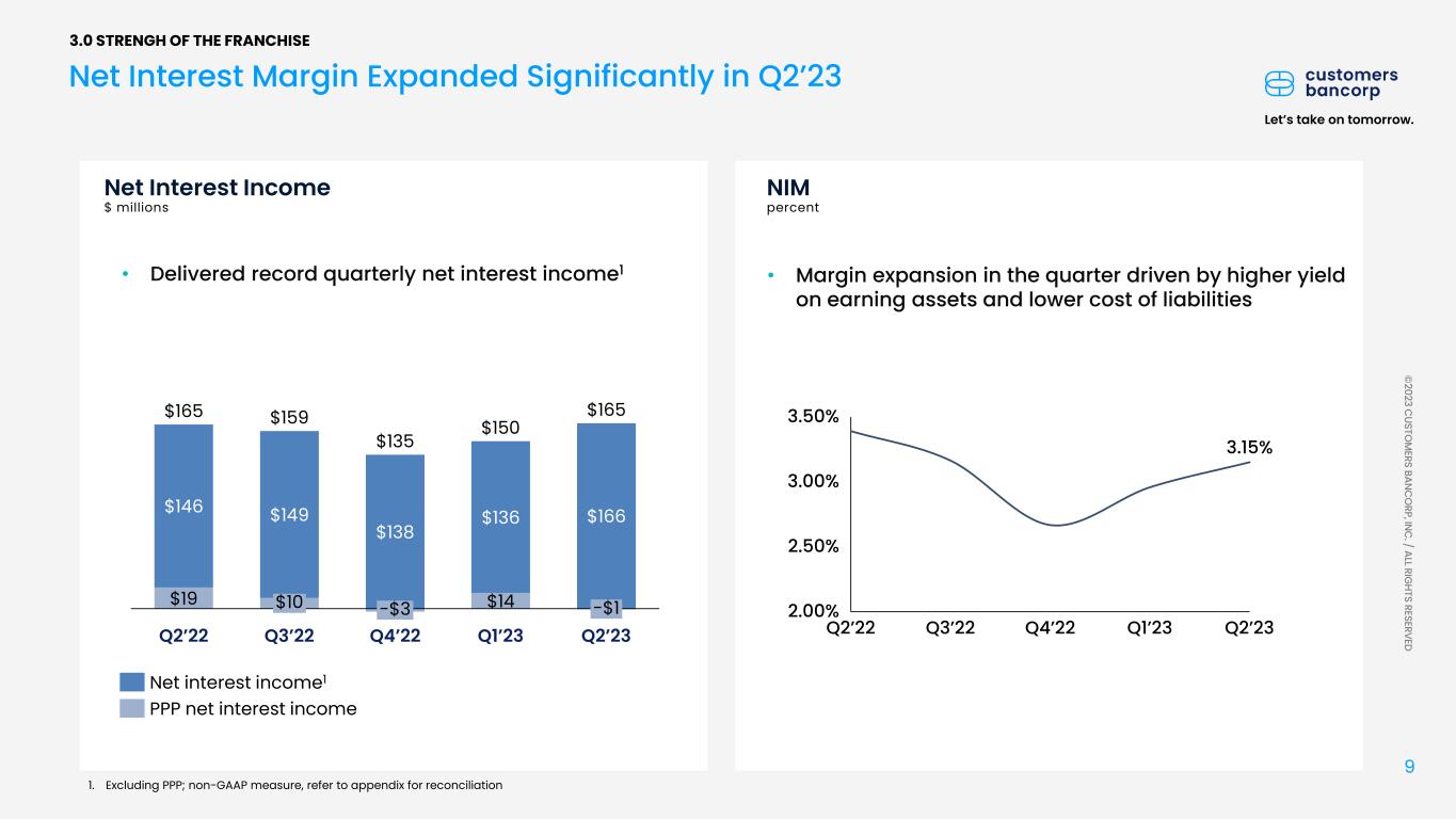 8 Let’s take on tomorrow. © 2023 C USTO M ERS BANC O RP, INC . / ALL RIG HTS RESERVED Total Deposits $ billions Successfully Executing on Deposit Remix and Reducing Cost of Deposits Despite Increase in Rates • Total deposits increased by ~$200 million QoQ with core deposit growth of ~$900 million • Non-interest bearing deposits increased by $1 billion QoQ (+29%) and account for 25% of total deposits • Average cost of deposits declined by 21 bps QoQ while spot cost of deposits declined by 1 bp $4.7 $6.6 $5.6 Q2’22 $3.0 $7.1 $7.4 Q3’22 $1.9 $8.5 $7.8 Q4’22 $3.5 (20%) $5.8 $8.4 Q1’23 $4.5 (25%) $5.6 $7.9 Q2’23 $16.9 $17.5 $18.2 $17.7 $18.0 Non-Interest Bearing DDA Interest Bearing DDA Non-DDA Average cost of deposits Insured Deposits1 / Total Deposits percent 88% 77% 66% Median 74% C UB I • CUBI’s insured deposits1 as a percentage of total deposits is 77% –among the higher end of regional bank peers2 CUBI (Q2’23) Regional Bank Peers2 (MRQ) Spot cost of deposits 1. Adjusted to account for affiliate and collateralized deposits; similar adjustment made to regional bank peers when publicly disclosed otherwise unadjusted reported figures used 2. Selected 2023 proxy peers as disclosed in appendix 3.08% 3.11% 3.09% 3.32% 3.0 STRENGH OF THE FRANCHISE