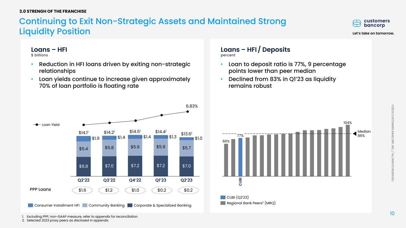 9 Let’s take on tomorrow. © 2023 C USTO M ERS BANC O RP, INC . / ALL RIG HTS RESERVED Net Interest Margin Expanded Significantly in Q2’23 NIM percent 1. Excluding PPP; non-GAAP measure, refer to appendix for reconciliation • Margin expansion in the quarter driven by higher yield on earning assets and lower cost of liabilities 3.15% 2.00% 2.50% 3.00% 3.50% Q2’22 Q3’22 Q4’22 Q1’23 Q2’23 $19 $138 $14 $166$146 $149 $136 Q2’22 $10 Q3’22 -$3 Q4’22 Q1’23 Q2’23 $165 $159 $135 $150 $165 -$1 Net Interest Income $ millions • Delivered record quarterly net interest income1 3.0 STRENGH OF THE FRANCHISE Net interest income1 PPP net interest income