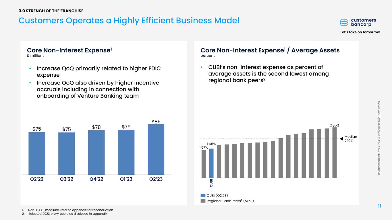 10 Let’s take on tomorrow. © 2023 C USTO M ERS BANC O RP, INC . / ALL RIG HTS RESERVED Continuing to Exit Non-Strategic Assets and Maintained Strong Liquidity Position Loans – HFI $ billions Loans – HFI / Deposits percent $1.9 $5.4 $6.8 Q2’22 $1.4 $5.8 $7.0 Q3’22 $1.4 $5.9 $7.2 Q4’22 $1.3 $5.9 $7.2 Q1’23 $1.0 $5.7 $7.0 Q2’23 $14.11 $14.21 $14.51 $14.41 $13.61 Consumer Installment HFI Community Banking Corporate & Specialized Banking • Loan to deposit ratio is 77%, 9 percentage points lower than peer median • Declined from 83% in Q1’23 as liquidity remains robust 1. Excluding PPP; non-GAAP measure, refer to appendix for reconciliation 2. Selected 2023 proxy peers as disclosed in appendix 66% 77% 104% C UB I Median 86% CUBI (Q2’23) Regional Bank Peers2 (MRQ) 6.83% Loan Yield • Reduction in HFI loans driven by exiting non-strategic relationships • Loan yields continue to increase given approximately 70% of loan portfolio is floating rate 3.0 STRENGH OF THE FRANCHISE $1.6 $1.2 $1.0 $0.2 $0.2PPP Loans