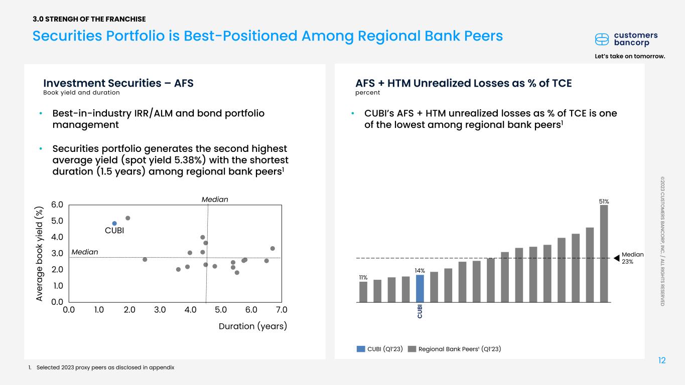 11 © 2023 C USTO M ERS BANC O RP, INC . / ALL RIG HTS RESERVED Let’s take on tomorrow. Customers Operates a Highly Efficient Business Model $75 $75 $78 $79 $89 Q2’22 Q3’22 Q4’22 Q1’23 Q2’23 Core Non-Interest Expense1 $ millions • Increase QoQ primarily related to higher FDIC expense • Increase QoQ also driven by higher incentive accruals including in connection with onboarding of Venture Banking team Core Non-Interest Expense1 / Average Assets percent • CUBI’s non-interest expense as percent of average assets is the second lowest among regional bank peers2 1.57% 1.65% 2.85% C UB I Median 2.10% CUBI (Q2’23) Regional Bank Peers2 (MRQ) 1. Non-GAAP measure, refer to appendix for reconciliation 2. Selected 2023 proxy peers as disclosed in appendix 3.0 STRENGH OF THE FRANCHISE