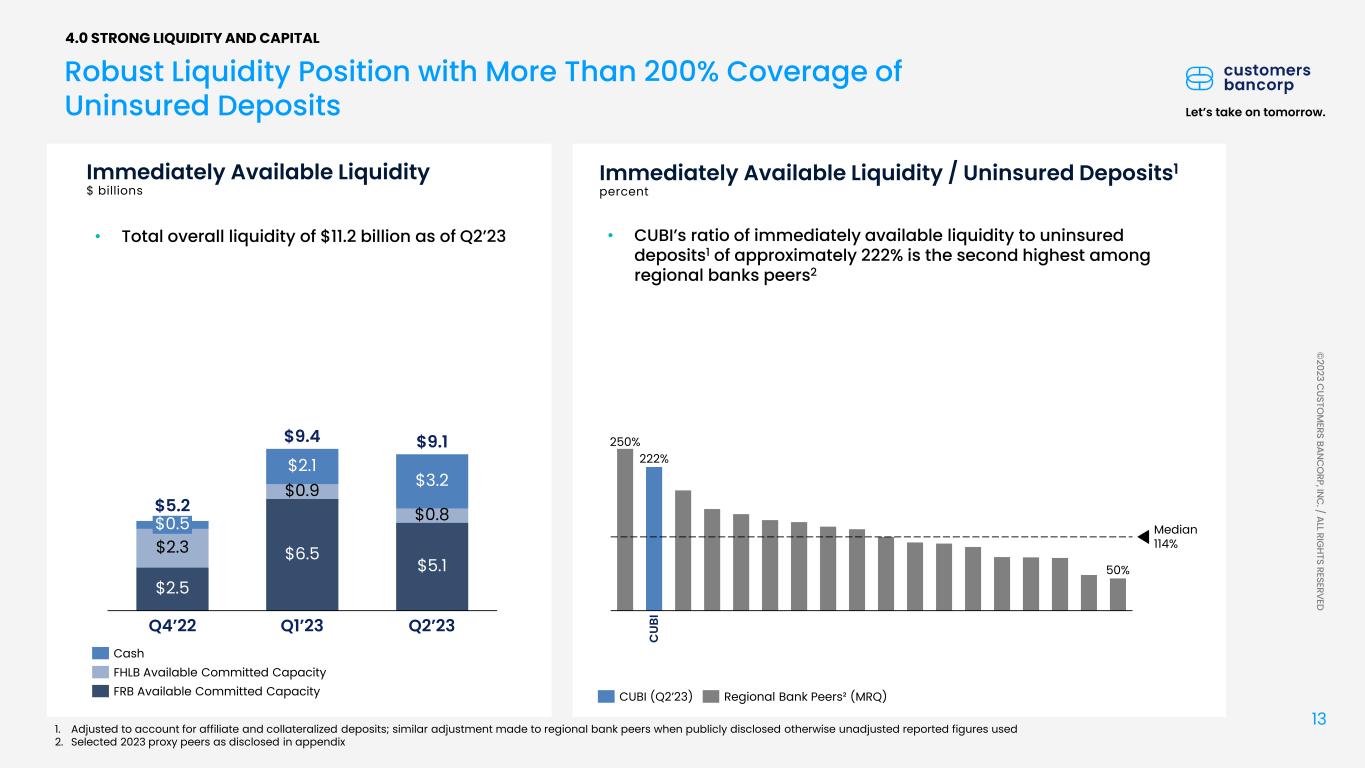 12 Let’s take on tomorrow. © 2023 C USTO M ERS BANC O RP, INC . / ALL RIG HTS RESERVED Investment Securities – AFS Book yield and duration • Best-in-industry IRR/ALM and bond portfolio management • Securities portfolio generates the second highest average yield (spot yield 5.38%) with the shortest duration (1.5 years) among regional bank peers1 Securities Portfolio is Best-Positioned Among Regional Bank Peers AFS + HTM Unrealized Losses as % of TCE percent 11% 14% 51% C UB I Median 23% • CUBI’s AFS + HTM unrealized losses as % of TCE is one of the lowest among regional bank peers1 0.0 1.0 2.0 3.0 4.0 5.0 6.0 7.0 0.0 1.0 2.0 3.0 4.0 5.0 6.0 Duration (years) Av er ag e bo ok y ie ld ( % ) CUBI CUBI (Q1’23) Regional Bank Peers¹ (Q1’23) 1. Selected 2023 proxy peers as disclosed in appendix Median Median 3.0 STRENGH OF THE FRANCHISE
