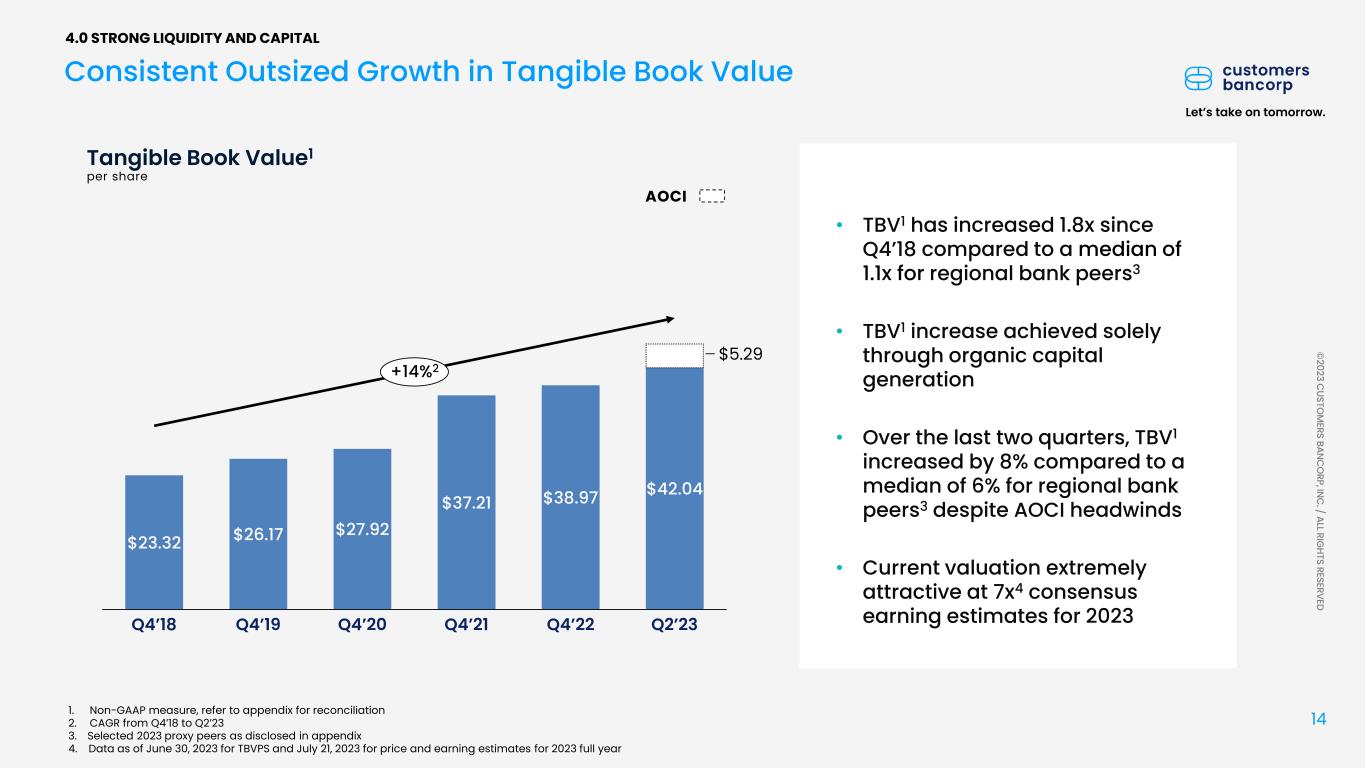 13 Let’s take on tomorrow. © 2023 C USTO M ERS BANC O RP, INC . / ALL RIG HTS RESERVED Robust Liquidity Position with More Than 200% Coverage of Uninsured Deposits Immediately Available Liquidity $ billions $0.5 $2.3 $2.5 Q4’22 $2.1 $0.9 $6.5 Q1’23 $3.2 $0.8 $5.1 Q2’23 $5.2 $9.4 $9.1 Cash FHLB Available Committed Capacity FRB Available Committed Capacity • Total overall liquidity of $11.2 billion as of Q2’23 Immediately Available Liquidity / Uninsured Deposits1 percent 250% 222% 50% C UB I Median 114% • CUBI’s ratio of immediately available liquidity to uninsured deposits1 of approximately 222% is the second highest among regional banks peers2 CUBI (Q2’23) Regional Bank Peers² (MRQ) 1. Adjusted to account for affiliate and collateralized deposits; similar adjustment made to regional bank peers when publicly disclosed otherwise unadjusted reported figures used 2. Selected 2023 proxy peers as disclosed in appendix 4.0 STRONG LIQUIDITY AND CAPITAL