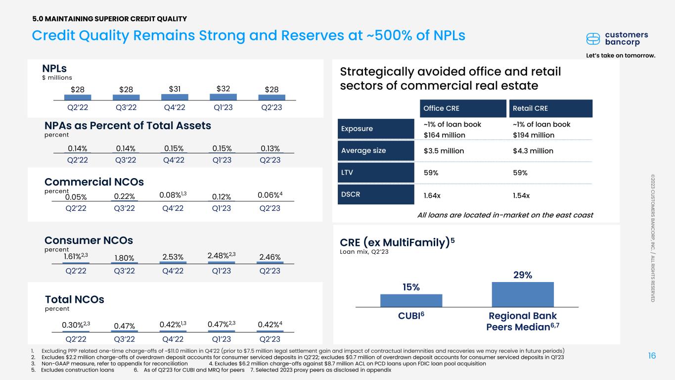 15 Let’s take on tomorrow. © 2023 C USTO M ERS BANC O RP, INC . / ALL RIG HTS RESERVED 12.6% 12.5% 12.2% 12.3% Q2’22 Q3’22 Q4’22 Q1’23 Q2’231 13.1% Total Risk-Based Capital percent 6.0% 6.1% 6.0% 5.9% 6.0% Q2’22 Q3’22 Q4’22 Q1’23 Q2’23 6.7% TCE/TA2,3 percent 1. Capital ratios are estimated pending final regulatory report 2. TCE/TA negatively impacted by 76 bps due to AOCI 3. Non-GAAP measure, refer to appendix for reconciliation 4. Compared to total cash balance of ~$400 million as of Q4’22 Increasing Capital Levels and on Track to Achieve our 2023 Year-End Target AOCI 9.7% 9.8% 9.6% 9.6% Q2’22 Q3’22 Q4’22 Q1’23 Q2’231 10.3% +0.7% CET1 Risk-Based Capital percent • Increase of approximately 70 bps in CET1 during Q2’23 even after the acquisition of Venture Banking loans • TCE/TA excluding increased balance sheet cash4 would have been 6.8% in Q2’23 • Balance sheet optimization from exiting non-strategic credit relationships − Capital call lines divested did not have a corresponding deposit relationship with Customers Bank CET1 Risk-Based Capital percent Q2’231 Organic Capital Generation Balance Sheet Optimization 0.5% 11.0% Q4’23E 10.3% ~0.6% 11.0-11.5% 4.0 STRONG LIQUIDITY AND CAPITAL