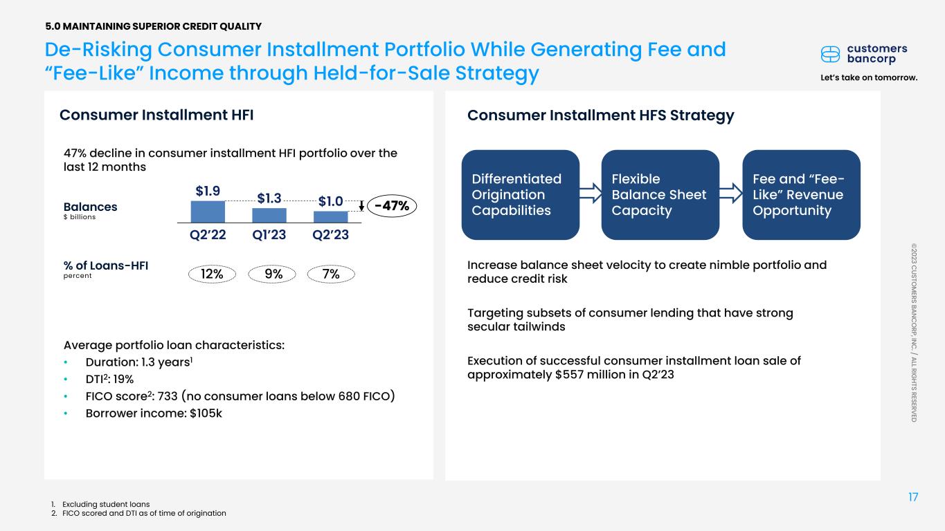 16 Let’s take on tomorrow. © 2023 C USTO M ERS BANC O RP, INC . / ALL RIG HTS RESERVED $28 $28 $31 $32 $28 Q2’22 Q3’22 Q4’22 Q1’23 Q2’23 NPLs $ millions Commercial NCOs percent 0.14% 0.14% 0.15% 0.15% 0.13% Q2’22 Q3’22 Q4’22 Q1’23 Q2’23 NPAs as Percent of Total Assets percent Credit Quality Remains Strong and Reserves at ~500% of NPLs 0.05% 0.22% 0.12% Q2’22 Q3’22 Q4’22 Q1’23 Q2’23 0.08%1,3 0.06%4 Strategically avoided office and retail sectors of commercial real estate 1. Excluding PPP related one-time charge-offs of ~$11.0 million in Q4’22 (prior to $7.5 million legal settlement gain and impact of contractual indemnities and recoveries we may receive in future periods) 2. Excludes $2.2 million charge-offs of overdrawn deposit accounts for consumer serviced deposits in Q2’22; excludes $0.7 million of overdrawn deposit accounts for consumer serviced deposits in Q1’23 3. Non-GAAP measure, refer to appendix for reconciliation 4. Excludes $6.2 million charge-offs against $8.7 million ACL on PCD loans upon FDIC loan pool acquisition 5. Excludes construction loans 6. As of Q2’23 for CUBI and MRQ for peers 7. Selected 2023 proxy peers as disclosed in appendix 1.80% 2.53% 2.46% Q2’22 Q3’22 Q4’22 Q1’23 Q2’23 1.61%2,3 2.48%2,3 0.47% Q2’22 Q3’22 Q4’22 Q1’23 Q2’23 0.30%2,3 0.42%1,3 0.47%2,3 0.42%4 Consumer NCOs percent Total NCOs percent CUBI6 Regional Bank Peers Median6,7 15% 29% CRE (ex MultiFamily)5 Loan mix, Q2’23 All loans are located in-market on the east coast 5.0 MAINTAINING SUPERIOR CREDIT QUALITY ~1% of loan book $164 million Office CRE Retail CRE Exposure Average size LTV DSCR $3.5 million 59% 1.64x ~1% of loan book $194 million $4.3 million 59% 1.54x