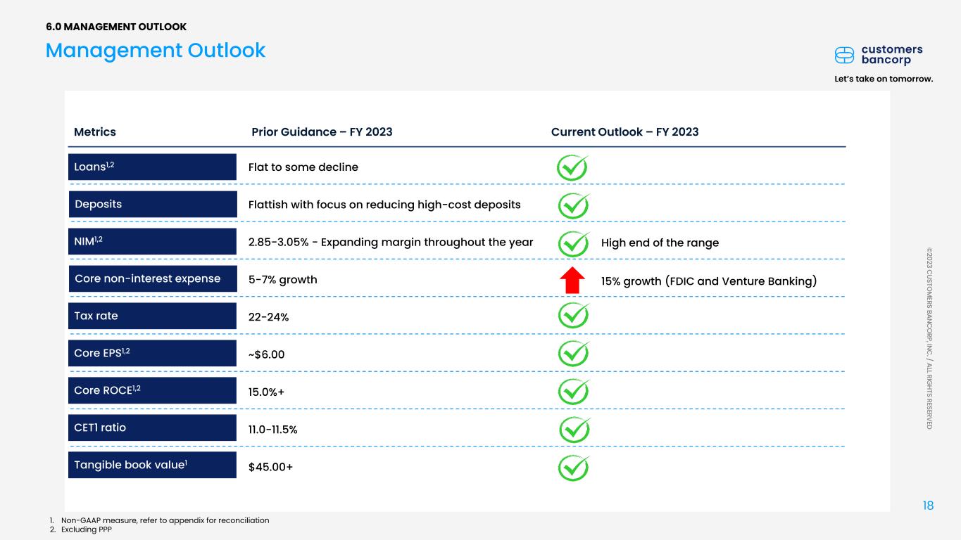 18 Let’s take on tomorrow. © 2023 C USTO M ERS BANC O RP, INC . / ALL RIG HTS RESERVED Management Outlook 1. Non-GAAP measure, refer to appendix for reconciliation 2. Excluding PPP 6.0 MANAGEMENT OUTLOOK Metrics Prior Guidance – FY 2023 Loans1,2 NIM1,2 Core EPS1,2 Tax rate Tangible book value1 Core non-interest expense CET1 ratio Flat to some decline 5-7% growth ~$6.00 22-24% 11.0-11.5% 2.85-3.05% - Expanding margin throughout the year $45.00+ Core ROCE1,2 15.0%+ Deposits Flattish with focus on reducing high-cost deposits Current Outlook – FY 2023 15% growth (FDIC and Venture Banking) High end of the range