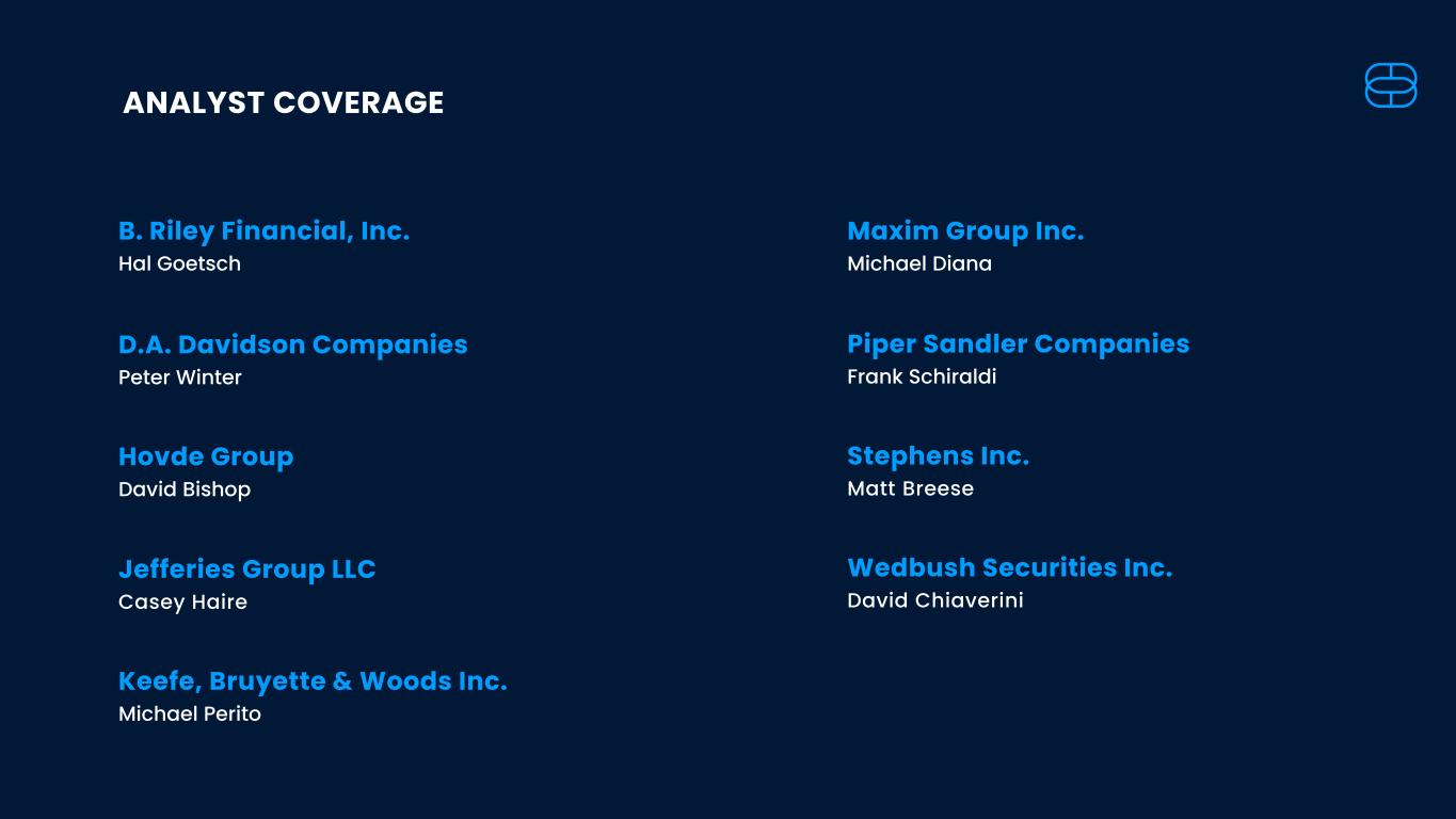 ANALYST COVERAGE D.A. Davidson Companies Peter Winter Hovde Group David Bishop Jefferies Group LLC Casey Haire Keefe, Bruyette & Woods Inc. Michael Perito Maxim Group Inc. Michael Diana Piper Sandler Companies Frank Schiraldi Stephens Inc. Matt Breese Wedbush Securities Inc. David Chiaverini B. Riley Financial, Inc. Hal Goetsch