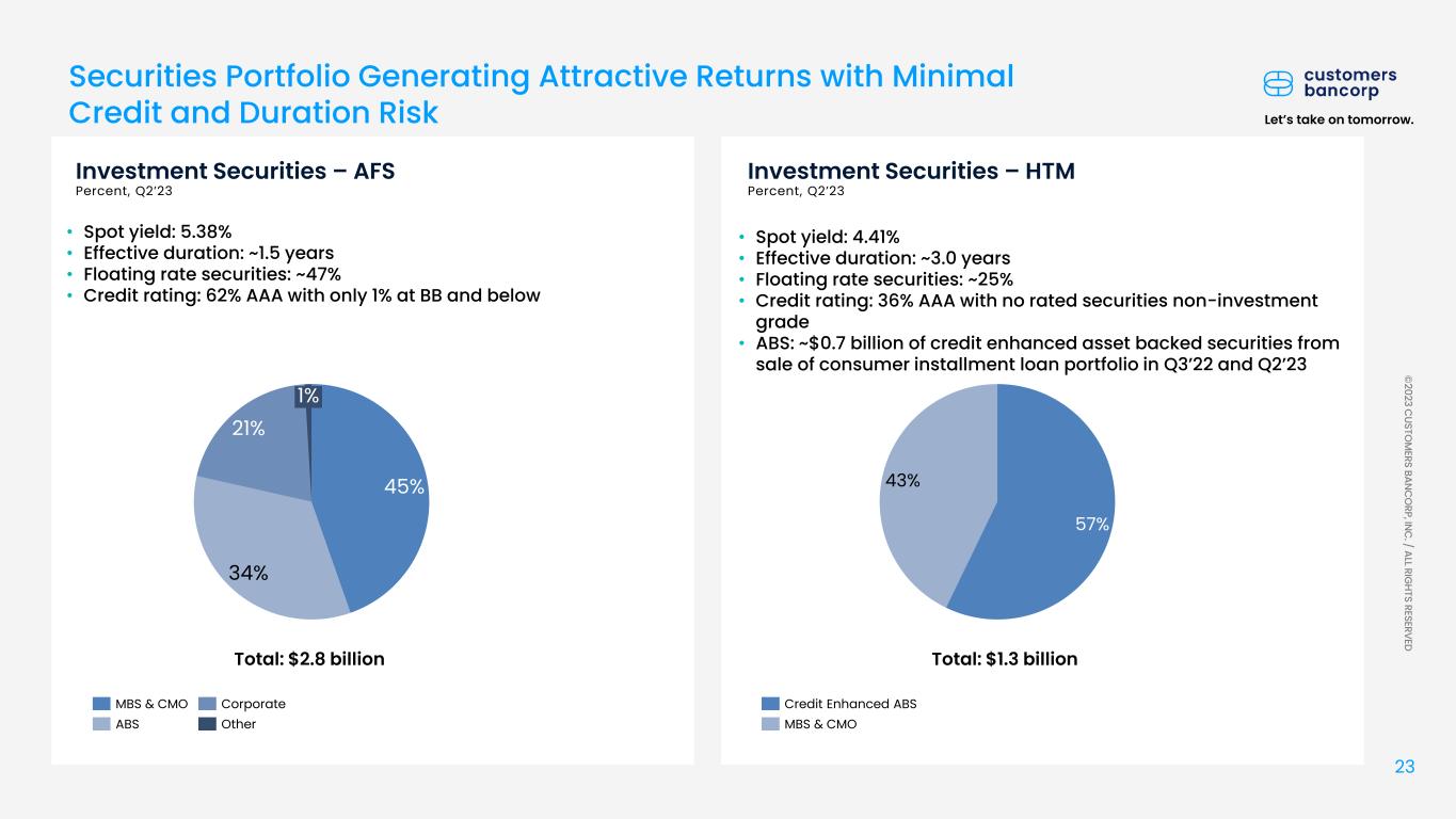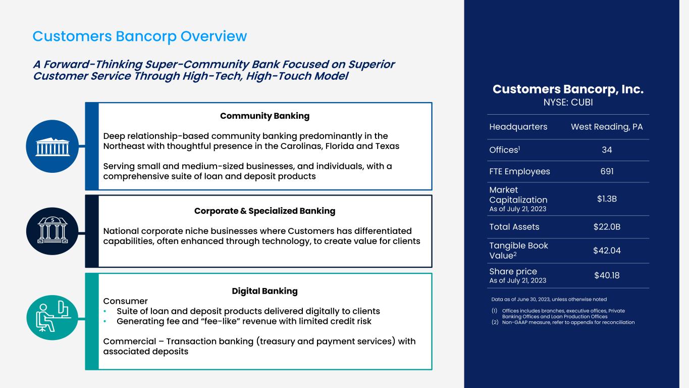 22 Let’s take on tomorrow. customers bancorp © 2023 C USTO M ERS BANC O RP, INC . / ALL RIG HTS RESERVED Customers Bancorp, Inc. NYSE: CUBI Headquarters West Reading, PA Offices1 34 FTE Employees 691 Market Capitalization As of July 21, 2023 $1.3B Total Assets $22.0B Tangible Book Value2 $42.04 Share price As of July 21, 2023 $40.18 Data as of June 30, 2023, unless otherwise noted (1) Offices includes branches, executive offices, Private Banking Offices and Loan Production Offices (2) Non-GAAP measure, refer to appendix for reconciliation A Forward-Thinking Super-Community Bank Focused on Superior Customer Service Through High-Tech, High-Touch Model Digital Banking Consumer • Suite of loan and deposit products delivered digitally to clients • Generating fee and “fee-like” revenue with limited credit risk Commercial – Transaction banking (treasury and payment services) with associated deposits Community Banking Deep relationship-based community banking predominantly in the Northeast with thoughtful presence in the Carolinas, Florida and Texas Serving small and medium-sized businesses, and individuals, with a comprehensive suite of loan and deposit products Customers Bancorp Overview Corporate & Specialized Banking National corporate niche businesses where Customers has differentiated capabilities, often enhanced through technology, to create value for clients