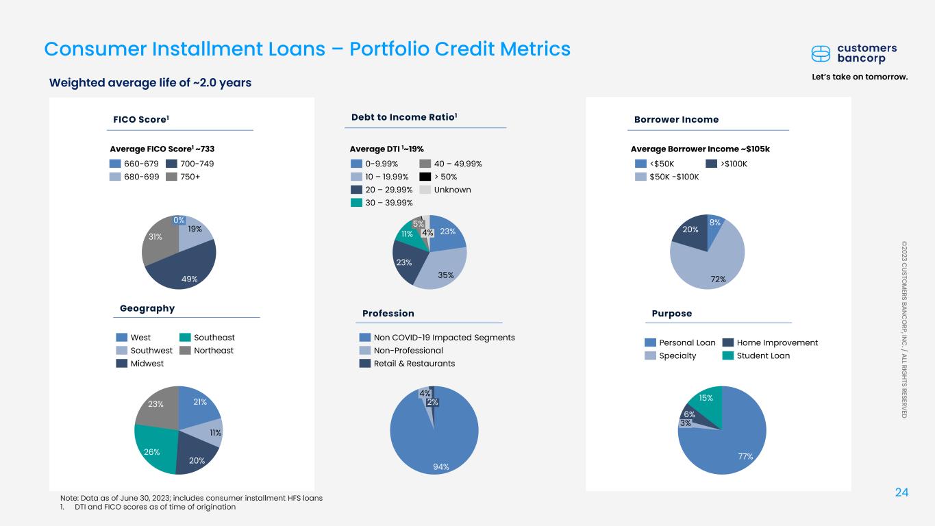 23 © 2023 C USTO M ERS BANC O RP, INC . / ALL RIG HTS RESERVED Let’s take on tomorrow. Investment Securities – AFS Percent, Q2’23 Securities Portfolio Generating Attractive Returns with Minimal Credit and Duration Risk • Spot yield: 5.38% • Effective duration: ~1.5 years • Floating rate securities: ~47% • Credit rating: 62% AAA with only 1% at BB and below 45% 34% 21% 1% MBS & CMO ABS Corporate Other Total: $2.8 billion Investment Securities – HTM Percent, Q2’23 • Spot yield: 4.41% • Effective duration: ~3.0 years • Floating rate securities: ~25% • Credit rating: 36% AAA with no rated securities non-investment grade • ABS: ~$0.7 billion of credit enhanced asset backed securities from sale of consumer installment loan portfolio in Q3’22 and Q2’23 57% 43% Credit Enhanced ABS MBS & CMO Total: $1.3 billion