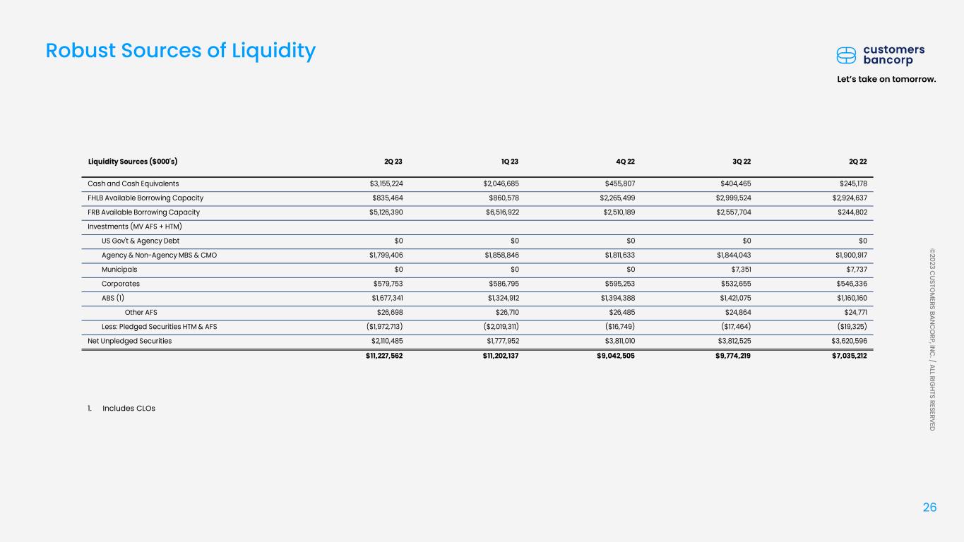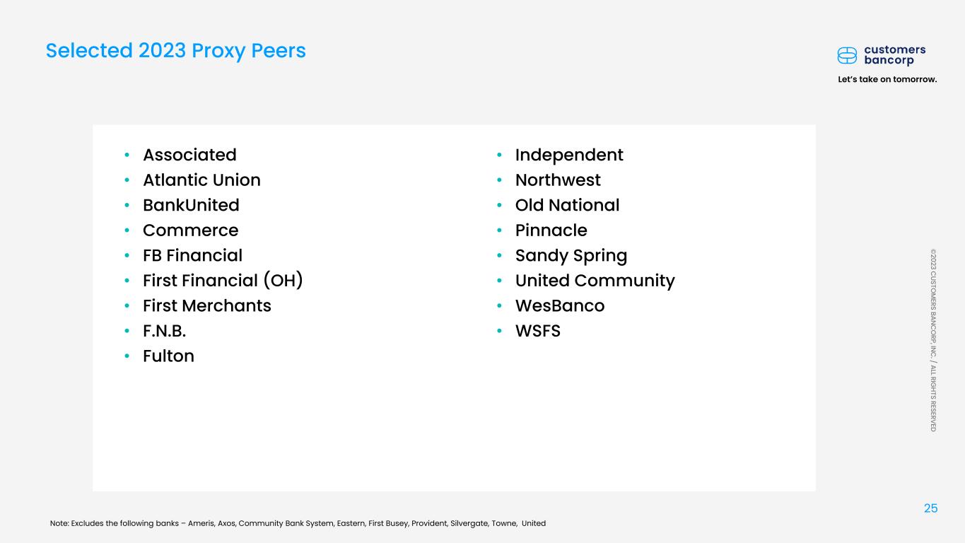 25 © 2023 C USTO M ERS BANC O RP, INC . / ALL RIG HTS RESERVED Let’s take on tomorrow. Selected 2023 Proxy Peers • Associated • Atlantic Union • BankUnited • Commerce • FB Financial • First Financial (OH) • First Merchants • F.N.B. • Fulton • Independent • Northwest • Old National • Pinnacle • Sandy Spring • United Community • WesBanco • WSFS Note: Excludes the following banks – Ameris, Axos, Community Bank System, Eastern, First Busey, Provident, Silvergate, Towne, United