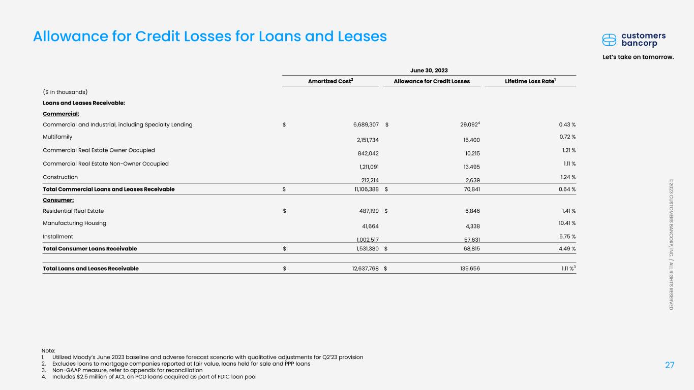 26 © 2023 C USTO M ERS BANC O RP, INC . / ALL RIG HTS RESERVED Let’s take on tomorrow. Robust Sources of Liquidity 1. Includes CLOs Liquidity Sources ($000's) 2Q 23 1Q 23 4Q 22 3Q 22 2Q 22 Cash and Cash Equivalents $3,155,224 $2,046,685 $455,807 $404,465 $245,178 FHLB Available Borrowing Capacity $835,464 $860,578 $2,265,499 $2,999,524 $2,924,637 FRB Available Borrowing Capacity $5,126,390 $6,516,922 $2,510,189 $2,557,704 $244,802 Investments (MV AFS + HTM) US Gov't & Agency Debt $0 $0 $0 $0 $0 Agency & Non-Agency MBS & CMO $1,799,406 $1,858,846 $1,811,633 $1,844,043 $1,900,917 Municipals $0 $0 $0 $7,351 $7,737 Corporates $579,753 $586,795 $595,253 $532,655 $546,336 ABS (1) $1,677,341 $1,324,912 $1,394,388 $1,421,075 $1,160,160 Other AFS $26,698 $26,710 $26,485 $24,864 $24,771 Less: Pledged Securities HTM & AFS ($1,972,713) ($2,019,311) ($16,749) ($17,464) ($19,325) Net Unpledged Securities $2,110,485 $1,777,952 $3,811,010 $3,812,525 $3,620,596 $11,227,562 $11,202,137 $9,042,505 $9,774,219 $7,035,212