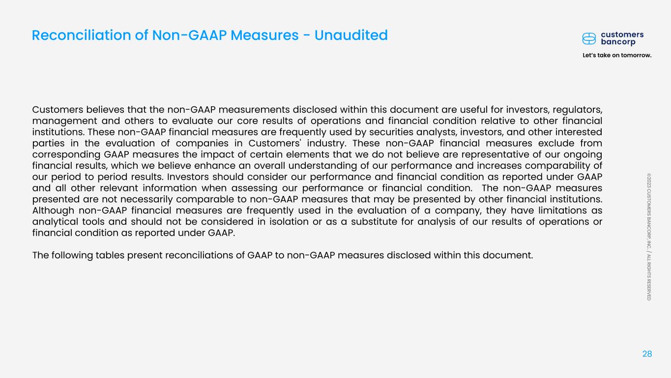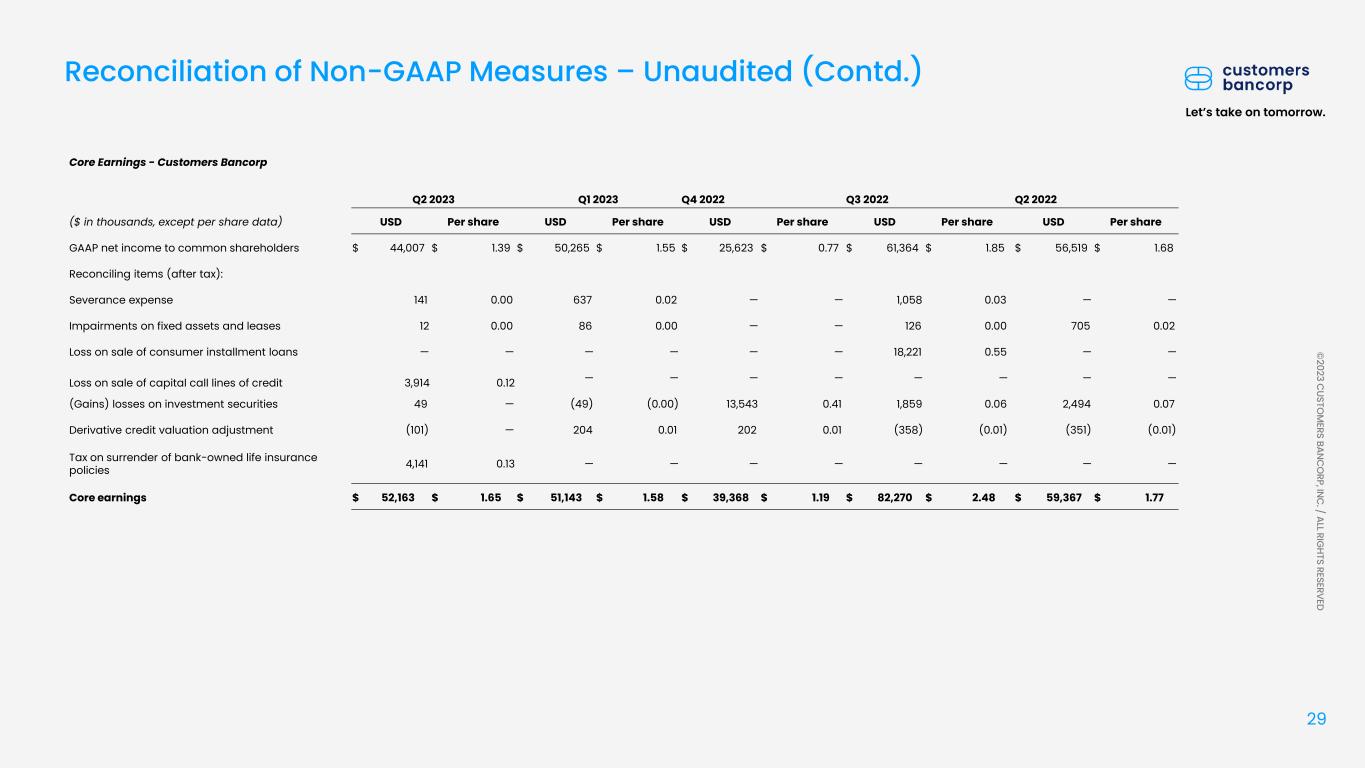 28 © 2023 C USTO M ERS BANC O RP, INC . / ALL RIG HTS RESERVED Let’s take on tomorrow. Customers believes that the non-GAAP measurements disclosed within this document are useful for investors, regulators, management and others to evaluate our core results of operations and financial condition relative to other financial institutions. These non-GAAP financial measures are frequently used by securities analysts, investors, and other interested parties in the evaluation of companies in Customers' industry. These non-GAAP financial measures exclude from corresponding GAAP measures the impact of certain elements that we do not believe are representative of our ongoing financial results, which we believe enhance an overall understanding of our performance and increases comparability of our period to period results. Investors should consider our performance and financial condition as reported under GAAP and all other relevant information when assessing our performance or financial condition. The non-GAAP measures presented are not necessarily comparable to non-GAAP measures that may be presented by other financial institutions. Although non-GAAP financial measures are frequently used in the evaluation of a company, they have limitations as analytical tools and should not be considered in isolation or as a substitute for analysis of our results of operations or financial condition as reported under GAAP. The following tables present reconciliations of GAAP to non-GAAP measures disclosed within this document. Reconciliation of Non-GAAP Measures - Unaudited