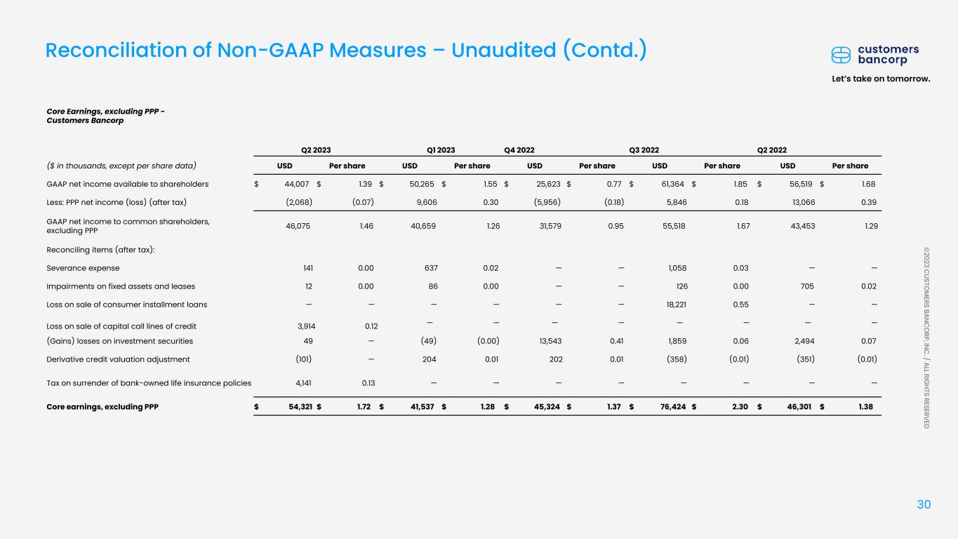 29 © 2023 C USTO M ERS BANC O RP, INC . / ALL RIG HTS RESERVED Let’s take on tomorrow. Reconciliation of Non-GAAP Measures – Unaudited (Contd.) Core Earnings - Customers Bancorp Q2 2023 Q1 2023 Q4 2022 Q3 2022 Q2 2022 ($ in thousands, except per share data) USD Per share USD Per share USD Per share USD Per share USD Per share GAAP net income to common shareholders $ 44,007 $ 1.39 $ 50,265 $ 1.55 $ 25,623 $ 0.77 $ 61,364 $ 1.85 $ 56,519 $ 1.68 Reconciling items (after tax): Severance expense 141 0.00 637 0.02 — — 1,058 0.03 — — Impairments on fixed assets and leases 12 0.00 86 0.00 — — 126 0.00 705 0.02 Loss on sale of consumer installment loans — — — — — — 18,221 0.55 — — Loss on sale of capital call lines of credit 3,914 0.12 — — — — — — — — (Gains) losses on investment securities 49 — (49) (0.00) 13,543 0.41 1,859 0.06 2,494 0.07 Derivative credit valuation adjustment (101) — 204 0.01 202 0.01 (358) (0.01) (351) (0.01) Tax on surrender of bank-owned life insurance policies 4,141 0.13 — — — — — — — — Core earnings $ 52,163 $ 1.65 $ 51,143 $ 1.58 $ 39,368 $ 1.19 $ 82,270 $ 2.48 $ 59,367 $ 1.77