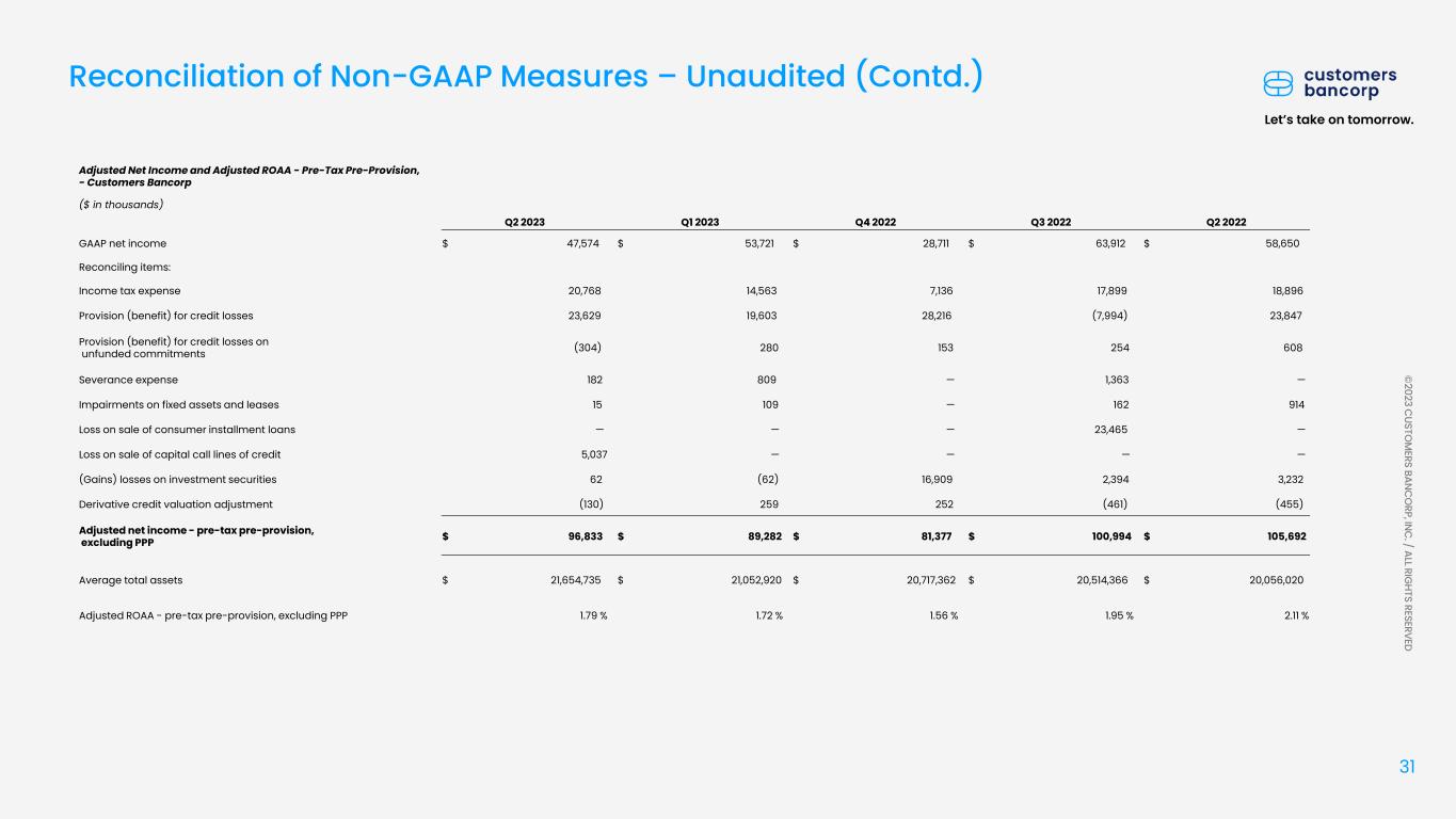 30 © 2023 C USTO M ERS BANC O RP, INC . / ALL RIG HTS RESERVED Let’s take on tomorrow. Reconciliation of Non-GAAP Measures – Unaudited (Contd.) Core Earnings, excluding PPP - Customers Bancorp Q2 2023 Q1 2023 Q4 2022 Q3 2022 Q2 2022 ($ in thousands, except per share data) USD Per share USD Per share USD Per share USD Per share USD Per share GAAP net income available to shareholders $ 44,007 $ 1.39 $ 50,265 $ 1.55 $ 25,623 $ 0.77 $ 61,364 $ 1.85 $ 56,519 $ 1.68 Less: PPP net income (loss) (after tax) (2,068) (0.07) 9,606 0.30 (5,956) (0.18) 5,846 0.18 13,066 0.39 GAAP net income to common shareholders, excluding PPP 46,075 1.46 40,659 1.26 31,579 0.95 55,518 1.67 43,453 1.29 Reconciling items (after tax): Severance expense 141 0.00 637 0.02 — — 1,058 0.03 — — Impairments on fixed assets and leases 12 0.00 86 0.00 — — 126 0.00 705 0.02 Loss on sale of consumer installment loans — — — — — — 18,221 0.55 — — Loss on sale of capital call lines of credit 3,914 0.12 — — — — — — — — (Gains) losses on investment securities 49 — (49) (0.00) 13,543 0.41 1,859 0.06 2,494 0.07 Derivative credit valuation adjustment (101) — 204 0.01 202 0.01 (358) (0.01) (351) (0.01) Tax on surrender of bank-owned life insurance policies 4,141 0.13 — — — — — — — — Core earnings, excluding PPP $ 54,321 $ 1.72 $ 41,537 $ 1.28 $ 45,324 $ 1.37 $ 76,424 $ 2.30 $ 46,301 $ 1.38