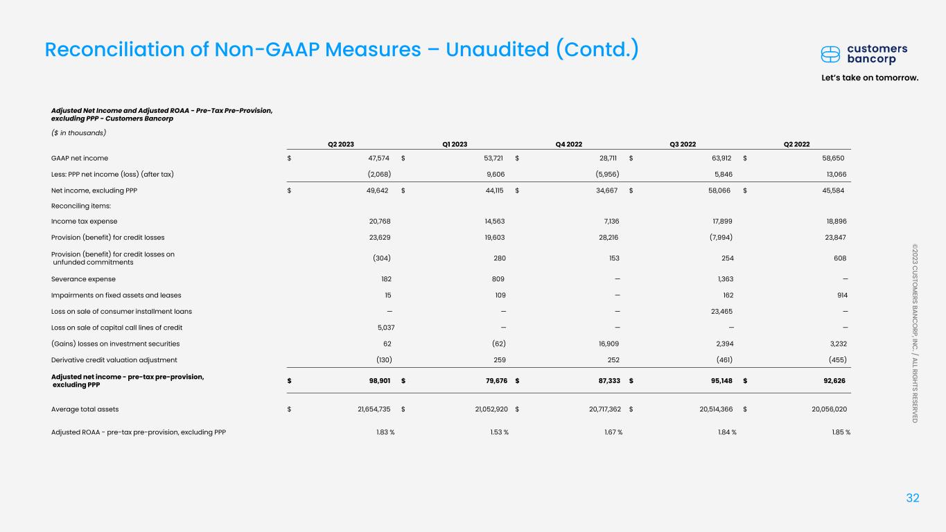 31 © 2023 C USTO M ERS BANC O RP, INC . / ALL RIG HTS RESERVED Let’s take on tomorrow. Reconciliation of Non-GAAP Measures – Unaudited (Contd.) Adjusted Net Income and Adjusted ROAA - Pre-Tax Pre-Provision, - Customers Bancorp ($ in thousands) Q2 2023 Q1 2023 Q4 2022 Q3 2022 Q2 2022 GAAP net income $ 47,574 $ 53,721 $ 28,711 $ 63,912 $ 58,650 Reconciling items: Income tax expense 20,768 14,563 7,136 17,899 18,896 Provision (benefit) for credit losses 23,629 19,603 28,216 (7,994) 23,847 Provision (benefit) for credit losses on unfunded commitments (304) 280 153 254 608 Severance expense 182 809 — 1,363 — Impairments on fixed assets and leases 15 109 — 162 914 Loss on sale of consumer installment loans — — — 23,465 — Loss on sale of capital call lines of credit 5,037 — — — — (Gains) losses on investment securities 62 (62) 16,909 2,394 3,232 Derivative credit valuation adjustment (130) 259 252 (461) (455) Adjusted net income - pre-tax pre-provision, excluding PPP $ 96,833 $ 89,282 $ 81,377 $ 100,994 $ 105,692 Average total assets $ 21,654,735 $ 21,052,920 $ 20,717,362 $ 20,514,366 $ 20,056,020 Adjusted ROAA - pre-tax pre-provision, excluding PPP 1.79 % 1.72 % 1.56 % 1.95 % 2.11 %