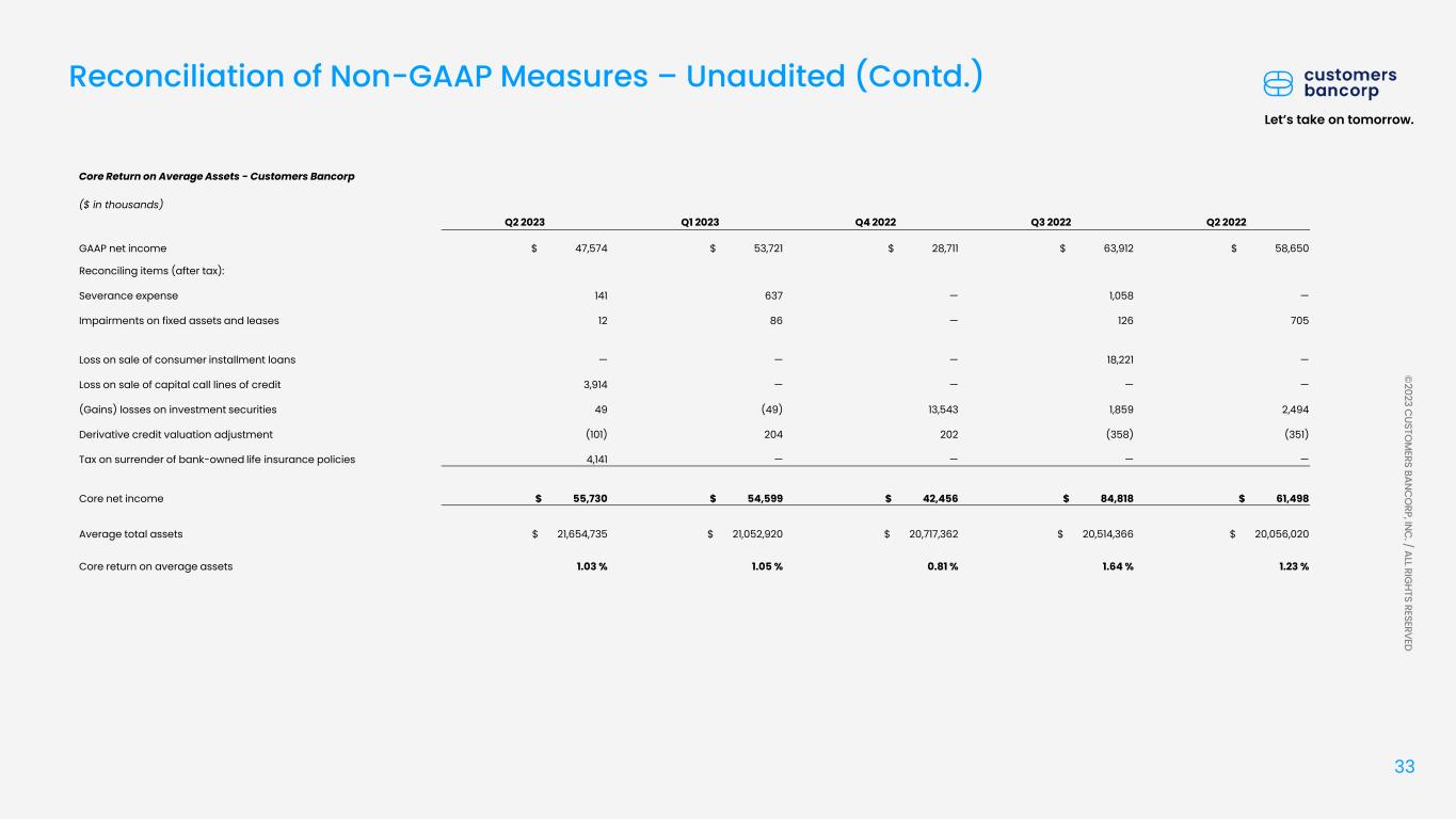 32 © 2023 C USTO M ERS BANC O RP, INC . / ALL RIG HTS RESERVED Let’s take on tomorrow. Reconciliation of Non-GAAP Measures – Unaudited (Contd.) Adjusted Net Income and Adjusted ROAA - Pre-Tax Pre-Provision, excluding PPP - Customers Bancorp ($ in thousands) Q2 2023 Q1 2023 Q4 2022 Q3 2022 Q2 2022 GAAP net income $ 47,574 $ 53,721 $ 28,711 $ 63,912 $ 58,650 Less: PPP net income (loss) (after tax) (2,068) 9,606 (5,956) 5,846 13,066 Net income, excluding PPP $ 49,642 $ 44,115 $ 34,667 $ 58,066 $ 45,584 Reconciling items: Income tax expense 20,768 14,563 7,136 17,899 18,896 Provision (benefit) for credit losses 23,629 19,603 28,216 (7,994) 23,847 Provision (benefit) for credit losses on unfunded commitments (304) 280 153 254 608 Severance expense 182 809 — 1,363 — Impairments on fixed assets and leases 15 109 — 162 914 Loss on sale of consumer installment loans — — — 23,465 — Loss on sale of capital call lines of credit 5,037 — — — — (Gains) losses on investment securities 62 (62) 16,909 2,394 3,232 Derivative credit valuation adjustment (130) 259 252 (461) (455) Adjusted net income - pre-tax pre-provision, excluding PPP $ 98,901 $ 79,676 $ 87,333 $ 95,148 $ 92,626 Average total assets $ 21,654,735 $ 21,052,920 $ 20,717,362 $ 20,514,366 $ 20,056,020 Adjusted ROAA - pre-tax pre-provision, excluding PPP 1.83 % 1.53 % 1.67 % 1.84 % 1.85 %