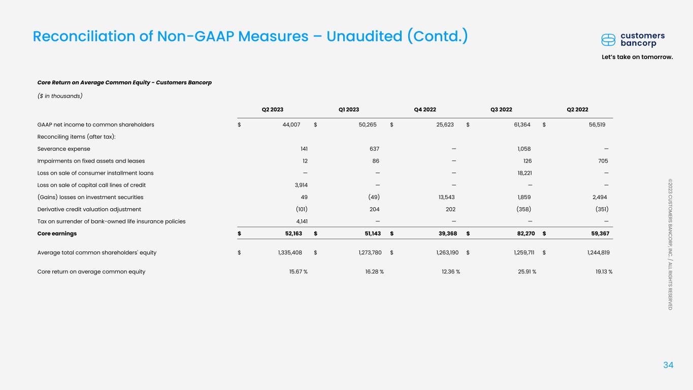 33 © 2023 C USTO M ERS BANC O RP, INC . / ALL RIG HTS RESERVED Let’s take on tomorrow. Reconciliation of Non-GAAP Measures – Unaudited (Contd.) Core Return on Average Assets - Customers Bancorp ($ in thousands) Q2 2023 Q1 2023 Q4 2022 Q3 2022 Q2 2022 GAAP net income $ 47,574 $ 53,721 $ 28,711 $ 63,912 $ 58,650 Reconciling items (after tax): Severance expense 141 637 — 1,058 — Impairments on fixed assets and leases 12 86 — 126 705 Loss on sale of consumer installment loans — — — 18,221 — Loss on sale of capital call lines of credit 3,914 — — — — (Gains) losses on investment securities 49 (49) 13,543 1,859 2,494 Derivative credit valuation adjustment (101) 204 202 (358) (351) Tax on surrender of bank-owned life insurance policies 4,141 — — — — Core net income $ 55,730 $ 54,599 $ 42,456 $ 84,818 $ 61,498 Average total assets $ 21,654,735 $ 21,052,920 $ 20,717,362 $ 20,514,366 $ 20,056,020 Core return on average assets 1.03 % 1.05 % 0.81 % 1.64 % 1.23 %