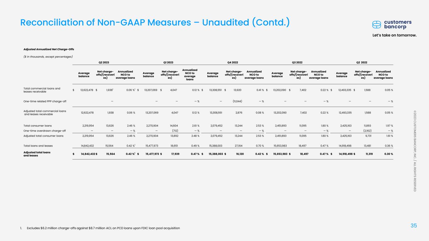 35 © 2023 C USTO M ERS BANC O RP, INC . / ALL RIG HTS RESERVED Let’s take on tomorrow. Reconciliation of Non-GAAP Measures – Unaudited (Contd.) Adjusted Annualized Net Charge-Offs ($ in thousands, except percentages) Q2 2023 Q1 2023 Q4 2022 Q3 2022 Q2 2022 Average balance Net charge- offs/(recoveri es) Annualized NCO to average loans Average balance Net charge- offs/(recoveri es) Annualized NCO to average loans Average balance Net charge- offs/(recoveri es) Annualized NCO to average loans Average balance Net charge- offs/(recoveri es) Annualized NCO to average loans Average balance Net charge- offs/(recoveri es) Annualized NCO to average loans Total commercial loans and leases receivable $ 12,622,478 $ 1,9381 0.06 %1 $ 13,207,069 $ 4,047 0.12 % $ 13,308,551 $ 13,920 0.41 % $ 13,202,090 $ 7,402 0.22 % $ 12,493,335 $ 1,588 0.05 % One-time related PPP charge-off — — — — % — (11,044) — % — — — % — — — % Adjusted total commercial loans and leases receivable 12,622,478 1,938 0.06 % 13,207,069 4,047 0.12 % 13,308,551 2,876 0.08 % 13,202,090 7,402 0.22 % 12,493,335 1,588 0.05 % Total consumer loans 2,219,954 13,626 2.46 % 2,270,904 14,604 2.61 % 2,079,452 13,244 2.53 % 2,451,893 11,095 1.80 % 2,425,163 11,893 1.97 % One-time overdrawn charge-off — — — % — (712) — % — — — % — — — % — (2,162) — % Adjusted total consumer loans 2,219,954 13,626 2.46 % 2,270,904 13,892 2.48 % 2,079,452 13,244 2.53 % 2,451,893 11,095 1.80 % 2,425,163 9,731 1.61 % Total loans and leases 14,842,432 15,564 0.42 %1 15,477,973 18,651 0.49 % 15,388,003 27,164 0.70 % 15,653,983 18,497 0.47 % 14,918,498 13,481 0.36 % Adjusted total loans and leases $ 14,842,432 $ 15,564 0.42 %1 $ 15,477,973 $ 17,939 0.47 % $ 15,388,003 $ 16,120 0.42 % $ 15,653,983 $ 18,497 0.47 % $ 14,918,498 $ 11,319 0.30 % 1. Excludes $6.2 million charge-offs against $8.7 million ACL on PCD loans upon FDIC loan pool acquisition