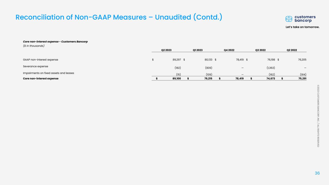 36 © 2023 C USTO M ERS BANC O RP, INC . / ALL RIG HTS RESERVED Let’s take on tomorrow. Reconciliation of Non-GAAP Measures – Unaudited (Contd.) Core non-interest expense - Customers Bancorp ($ in thousands) Q2 2023 Q1 2023 Q4 2022 Q3 2022 Q2 2022 GAAP non-interest expense $ 89,297 $ 80,133 $ 78,419 $ 76,198 $ 76,205 Severance expense (182) (809) — (1,363) — Impairments on fixed assets and leases (15) (109) — (162) (914) Core non-interest expense $ 89,100 $ 79,215 $ 78,419 $ 74,673 $ 75,291