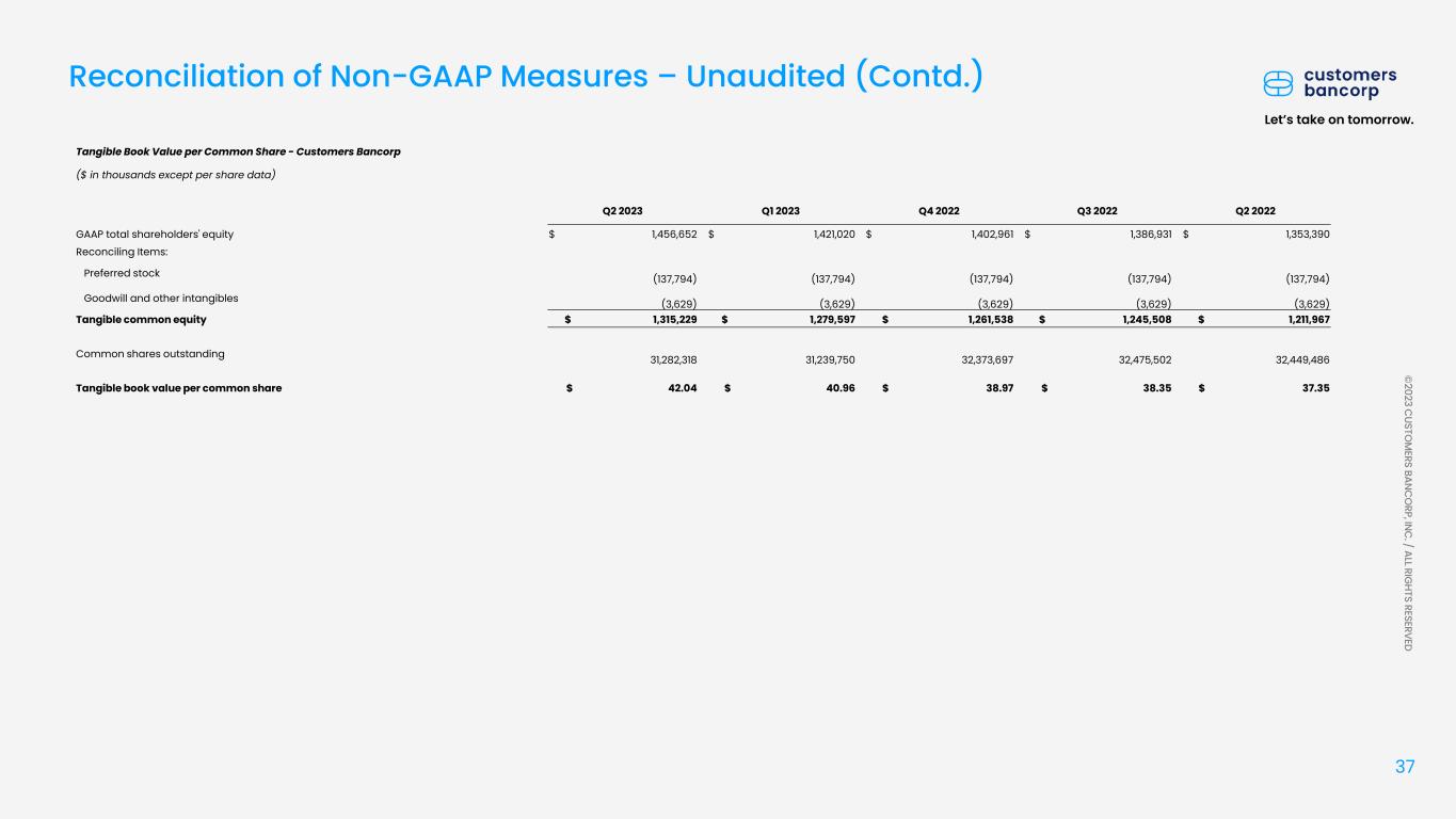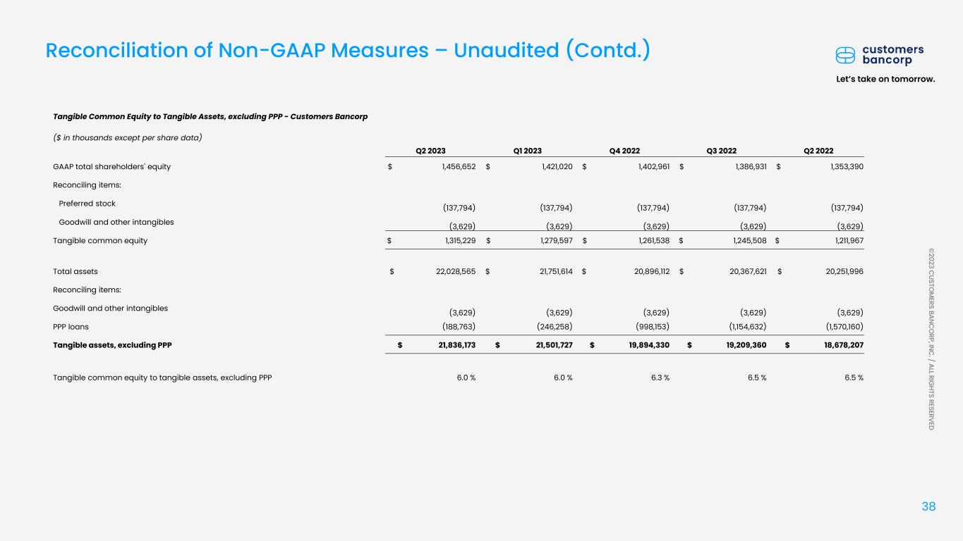 37 © 2023 C USTO M ERS BANC O RP, INC . / ALL RIG HTS RESERVED Let’s take on tomorrow. Reconciliation of Non-GAAP Measures – Unaudited (Contd.) Tangible Book Value per Common Share - Customers Bancorp ($ in thousands except per share data) Q2 2023 Q1 2023 Q4 2022 Q3 2022 Q2 2022 GAAP total shareholders' equity $ 1,456,652 $ 1,421,020 $ 1,402,961 $ 1,386,931 $ 1,353,390 Reconciling Items: Preferred stock (137,794) (137,794) (137,794) (137,794) (137,794) Goodwill and other intangibles (3,629) (3,629) (3,629) (3,629) (3,629) Tangible common equity $ 1,315,229 $ 1,279,597 $ 1,261,538 $ 1,245,508 $ 1,211,967 Common shares outstanding 31,282,318 31,239,750 32,373,697 32,475,502 32,449,486 Tangible book value per common share $ 42.04 $ 40.96 $ 38.97 $ 38.35 $ 37.35